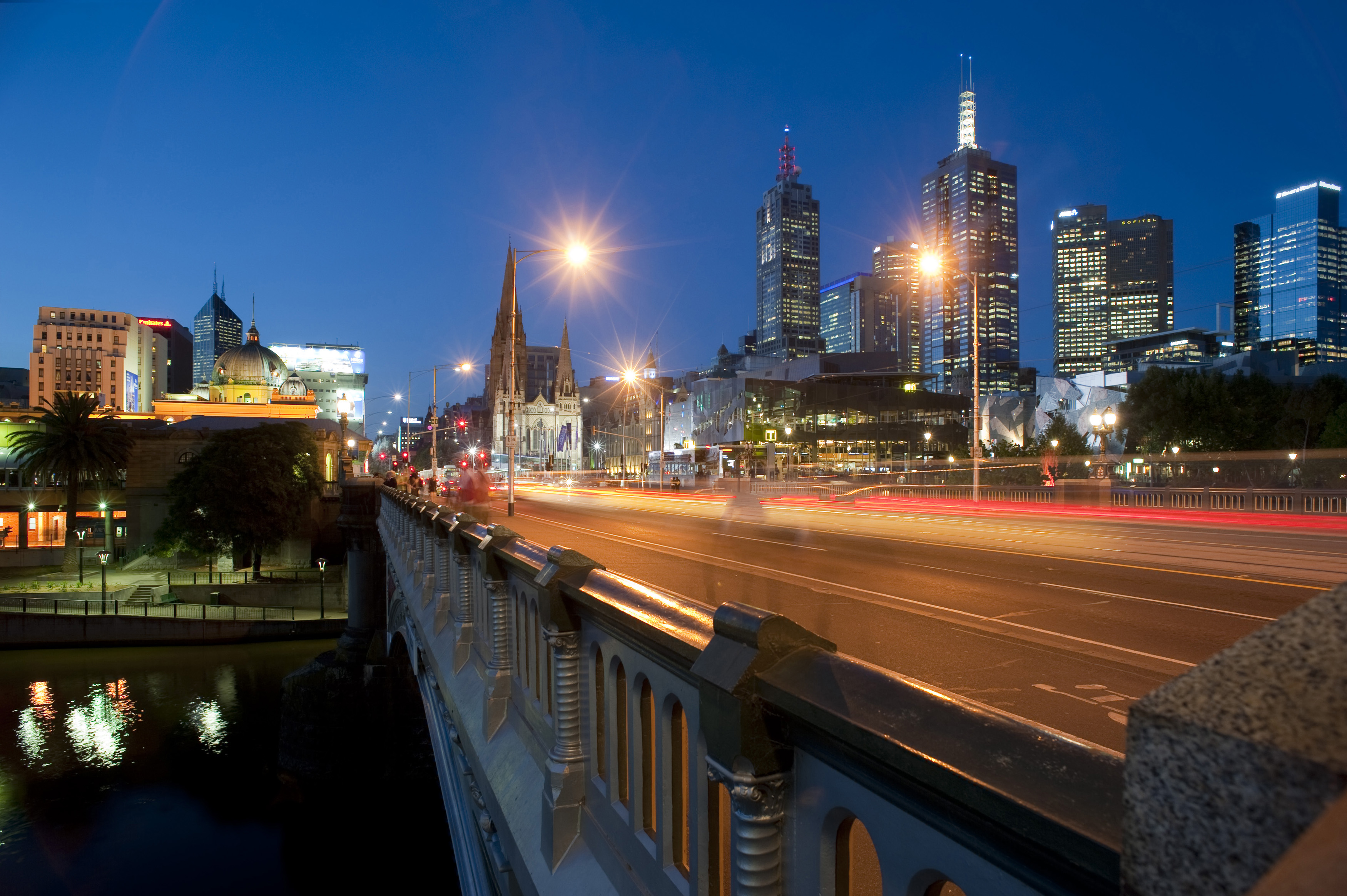Image Description: office buildings and traffic in central melbourne pictured at twilight