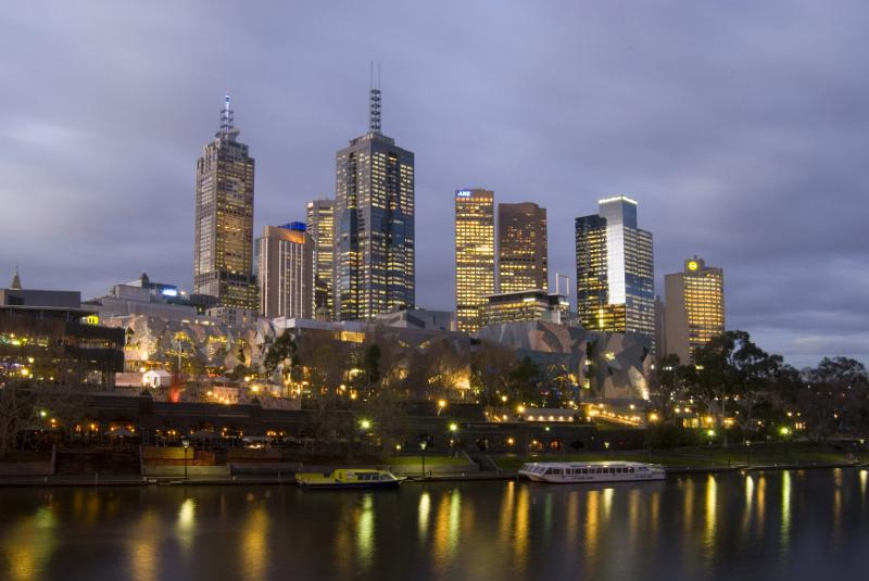 Image Description: Melbourne, Australia CBD at night with light reflections in the water and skyscrapers against a cloudy grey sky in a travel and tourism concpet