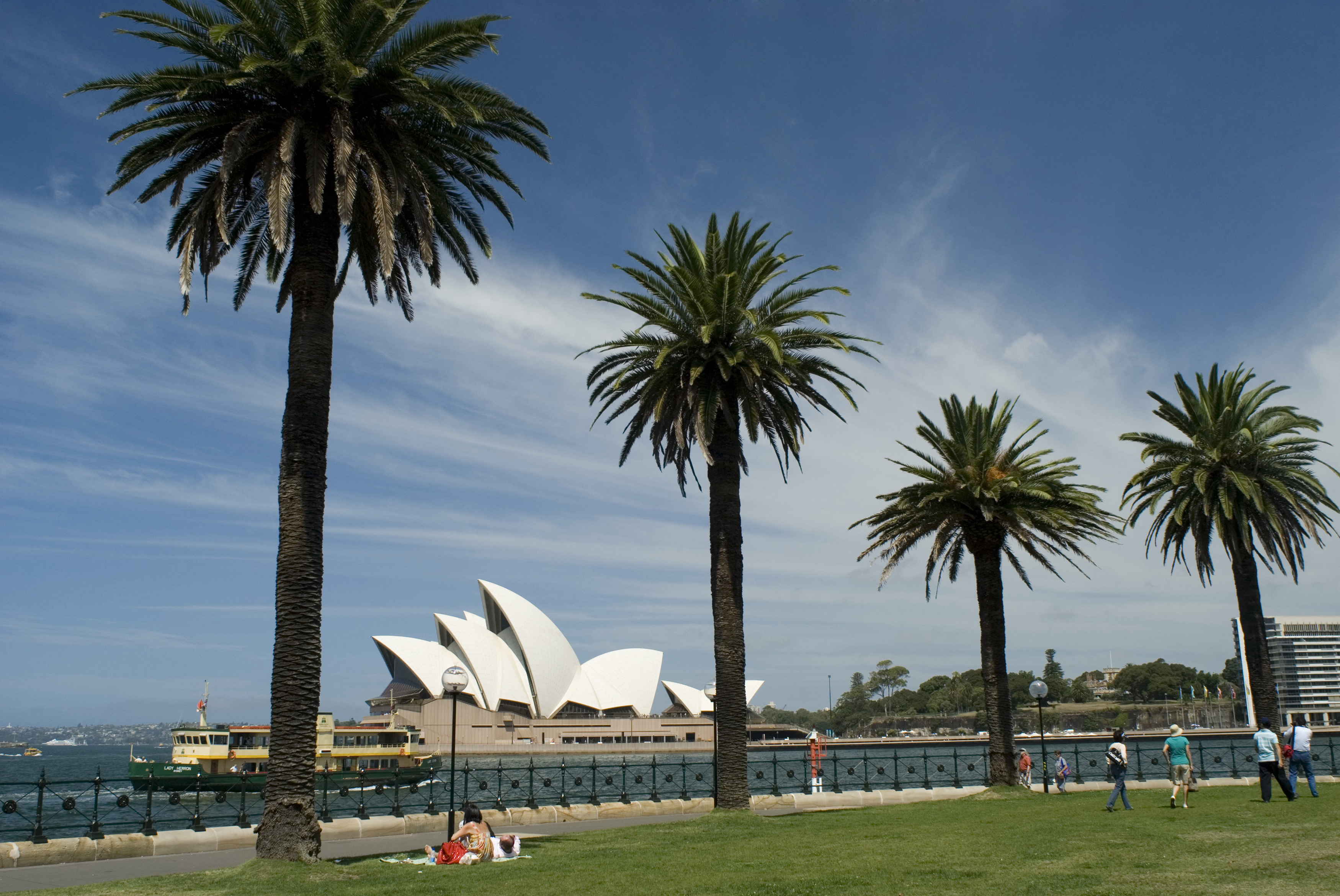 Image Description: Circular Quay in Sydney harbour with a view through tropical palm trees of the iconic Sydney Opera House, Australia in a travel concept