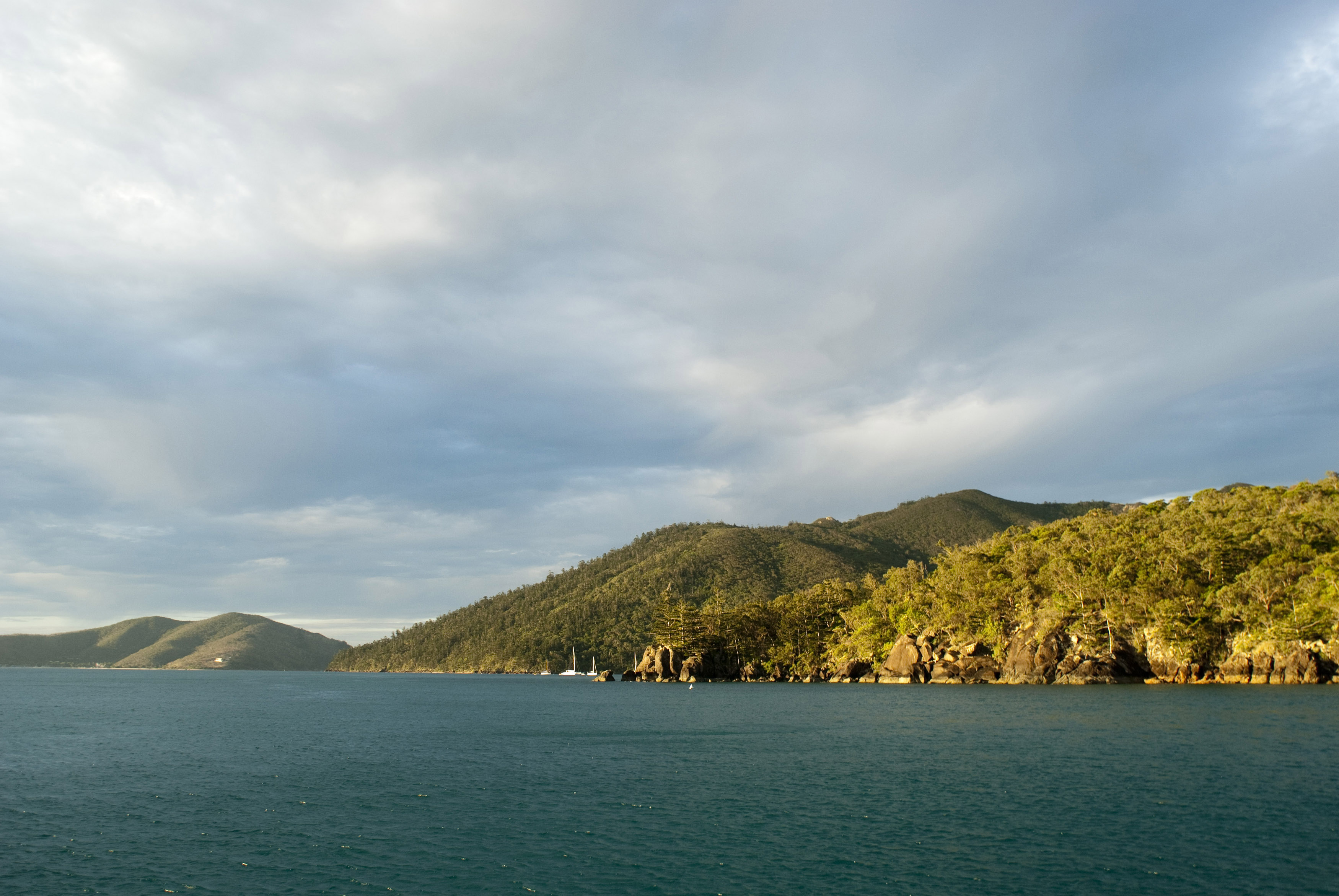 Image Description: A mecca for sailing: stormy sunset light illuminates the tropical forest and sea on Whitsunday Island in Queensland, Australia.