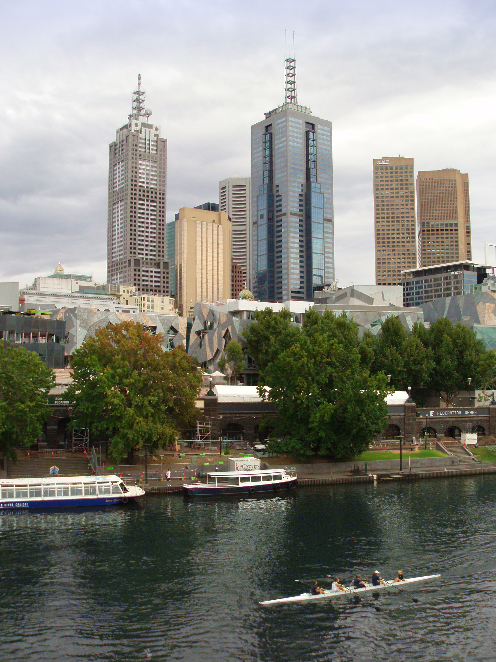 Image Description: Skyline view of the modern architecture in Melbourne CBD with the Yarra River in the foreground, Australia, in a travel and tourism concept