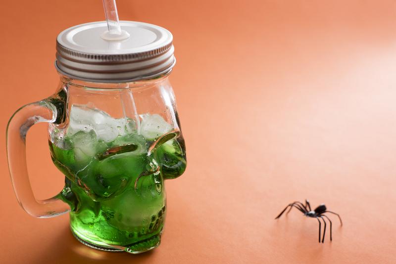 Image Description: Creepy spider with a green Halloween drink in a glass skull shaped mason jar with lid and straw over an orange background with copy space