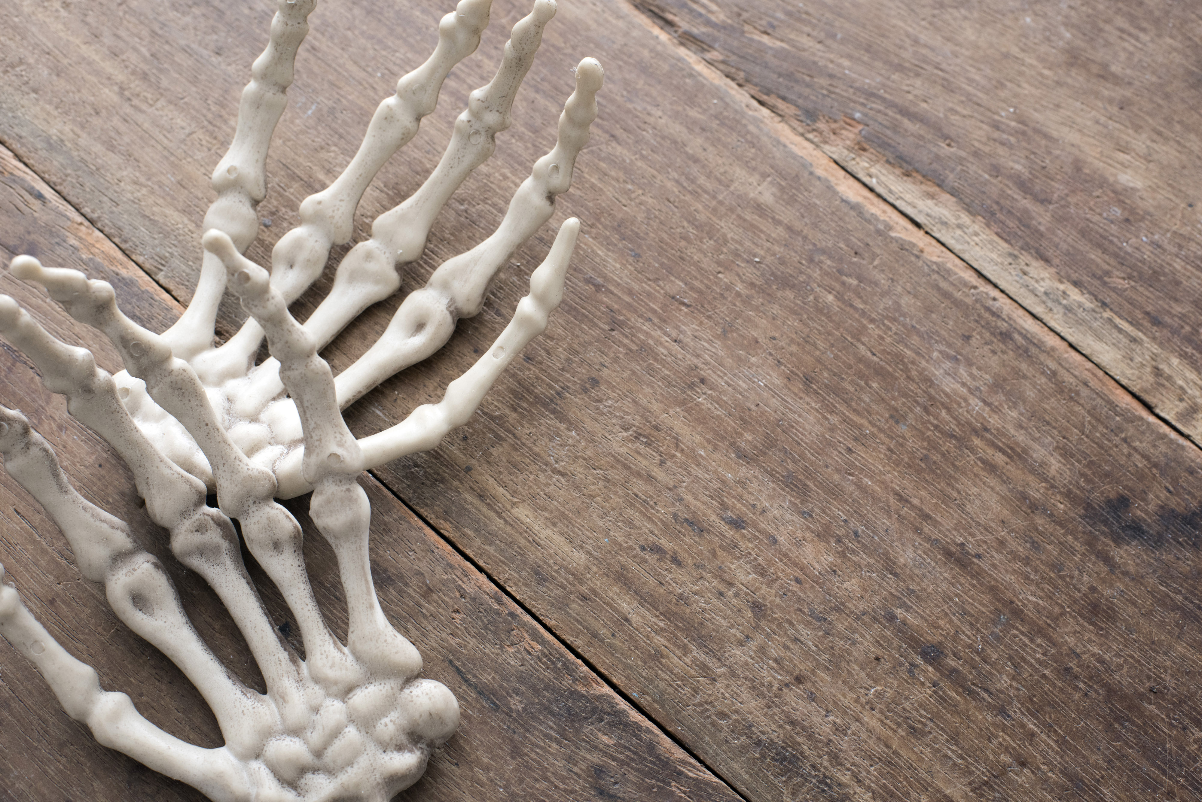 Image Description: halloween boney hands on a rustic wooden backdrop