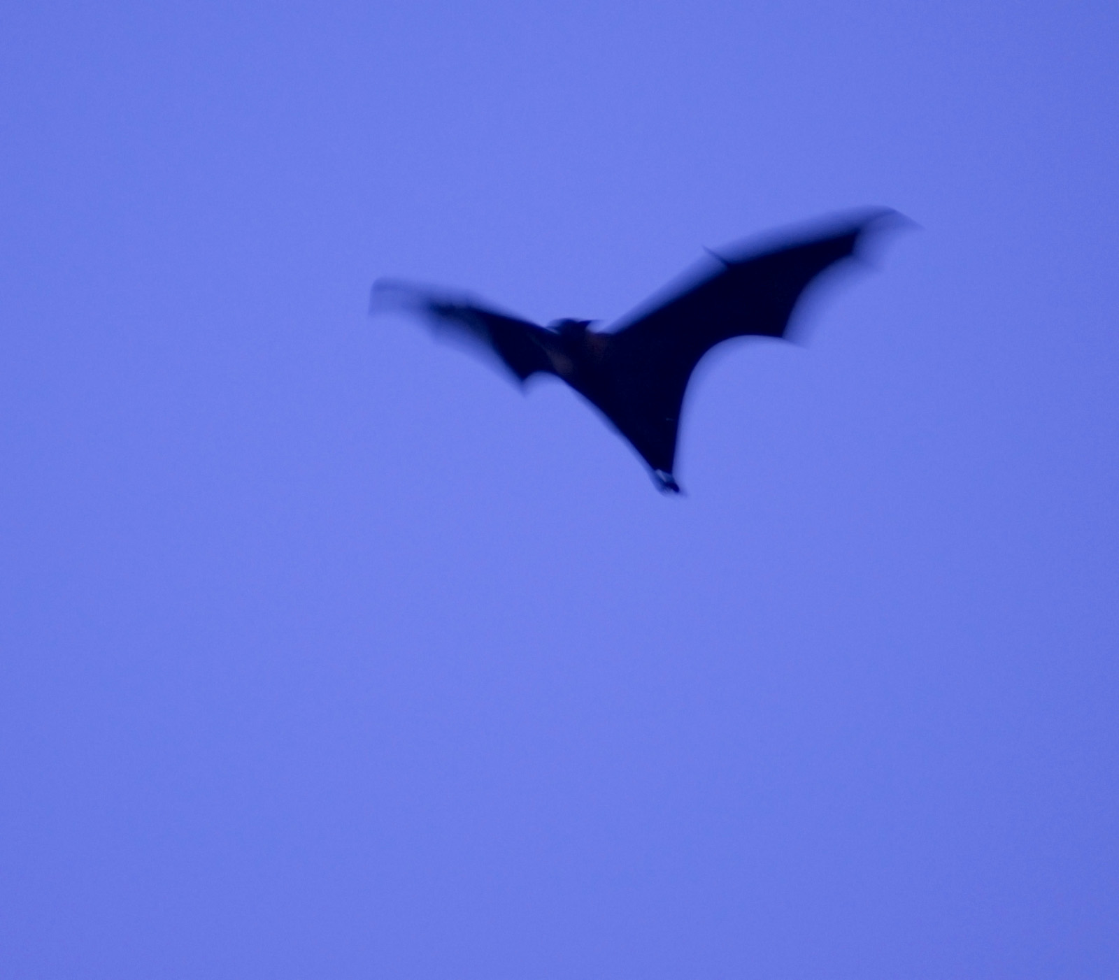 Image Description: black bat on blue sky with blurred flapping rings