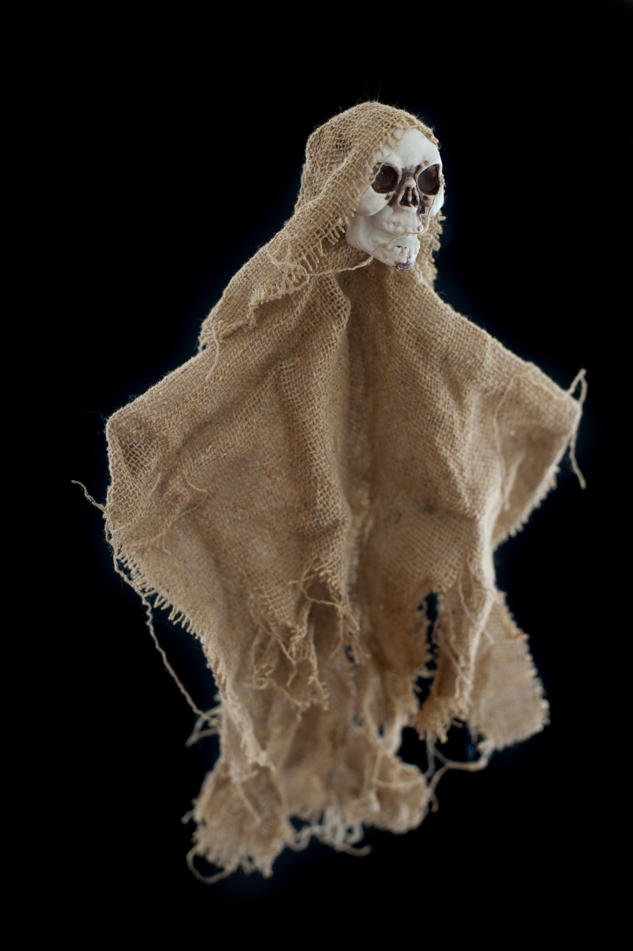Image Description: Rustic Halloween skull decoration wrapped in tattered burlap over a black background