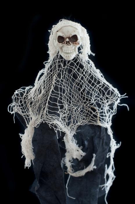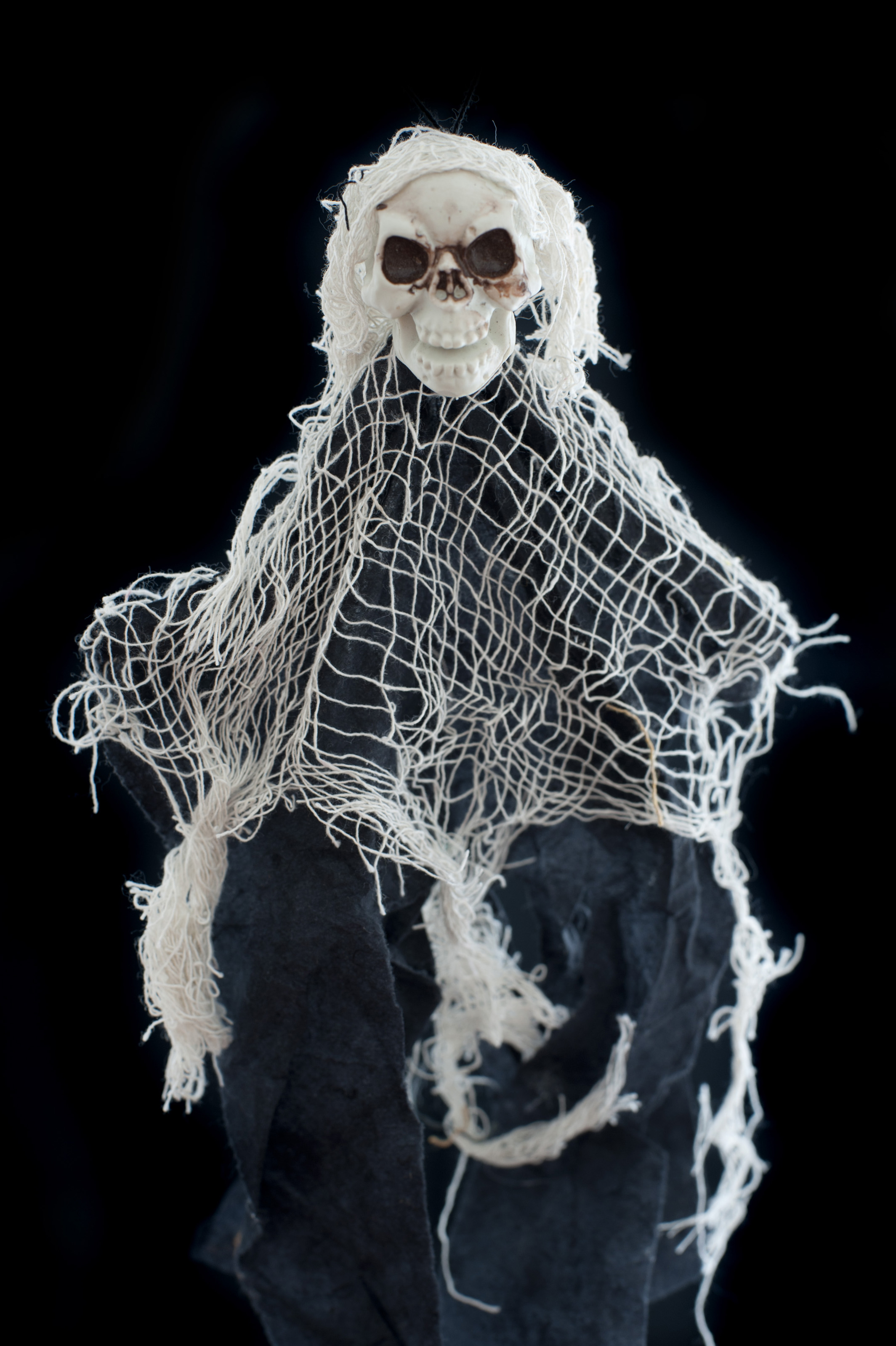 Image Description: Spooky Halloween witch doll with frayed rustic hessian fabric around a skull with spooky dark eye sockets isolated on a black background