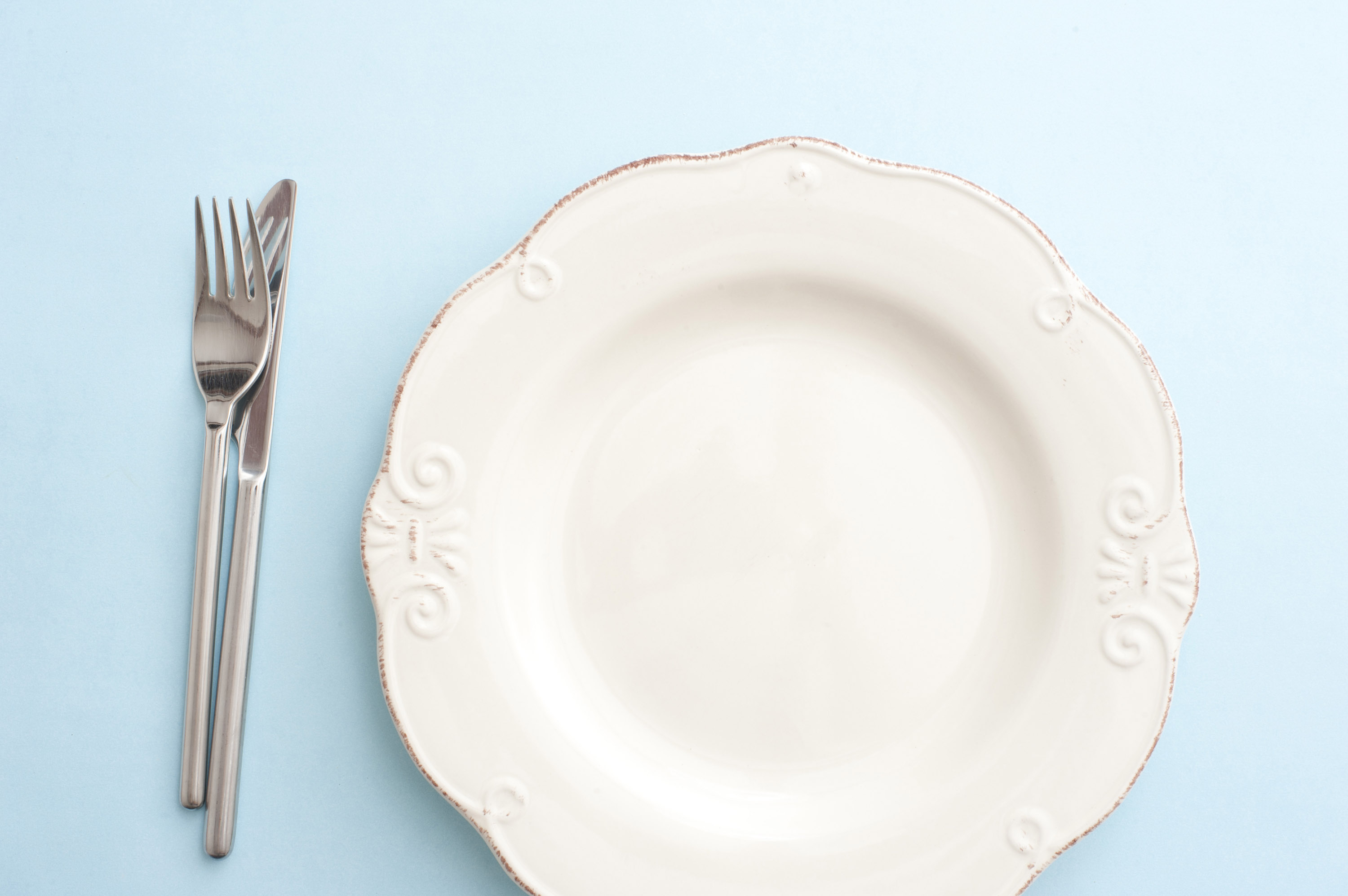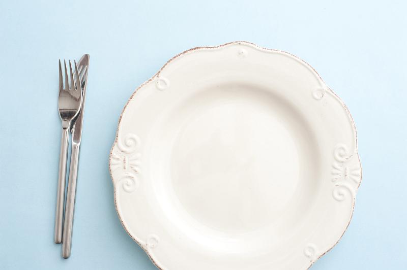 Image Description: Clean empty white dinner plate on a table with cutlery alongside viewed from overhead in a food and catering concept