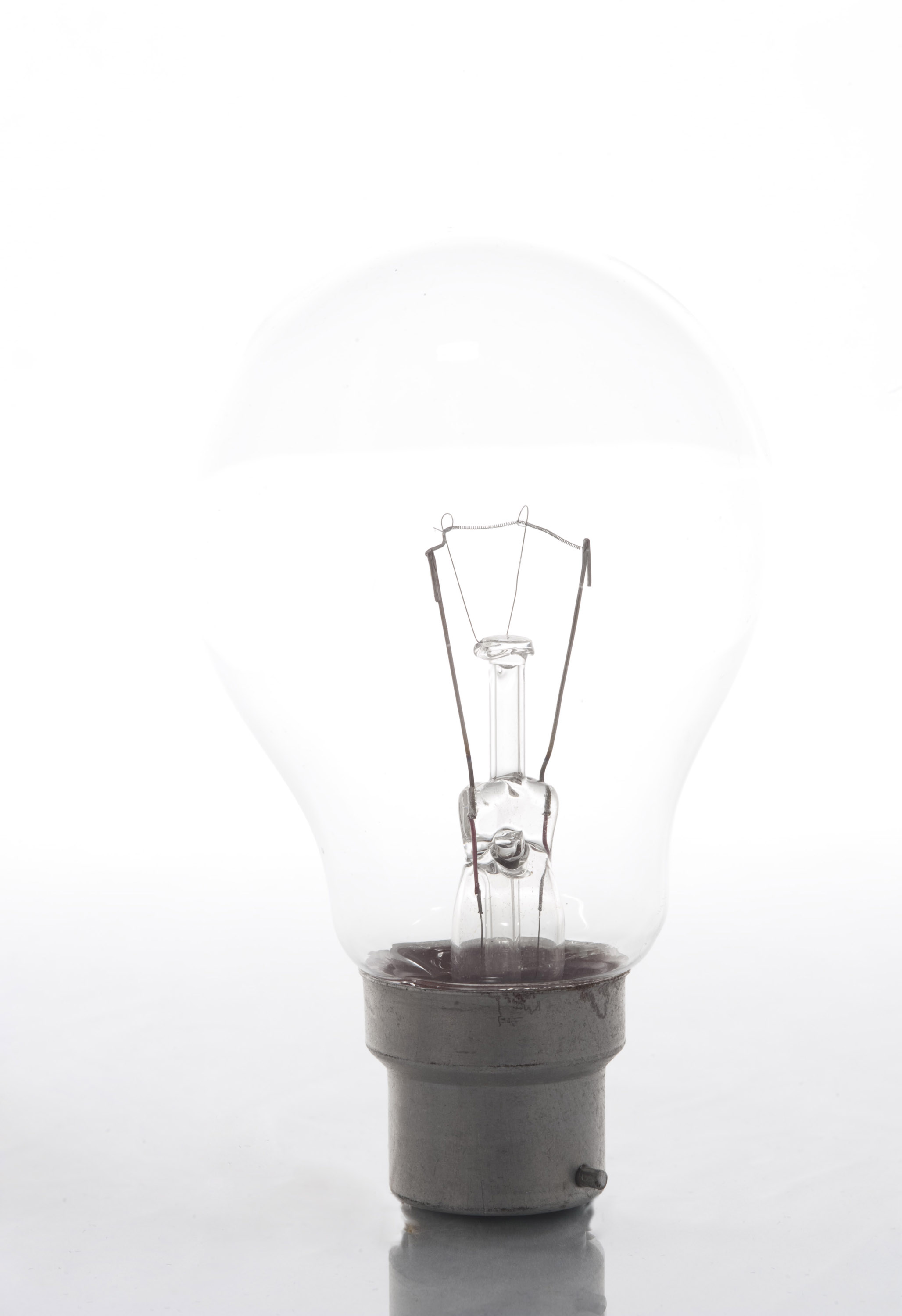 Image Description: Incandescent lightbulb with bayonet mount socket type placed vertically on glossy surface against white background