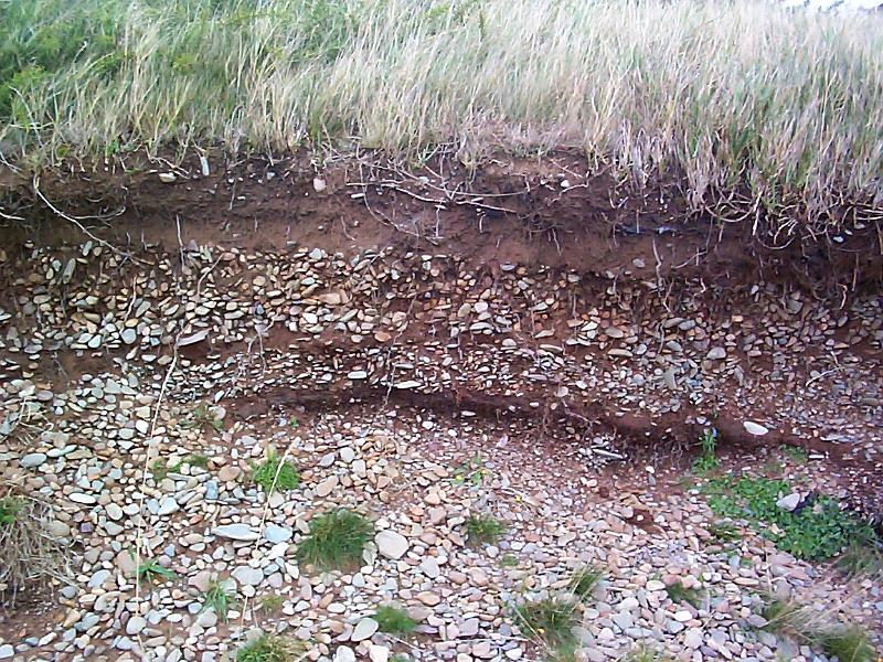Image Description: Coastal erosion concept showing an eroded grassy bank with soil wash away and exposed substrata in an environmental issue