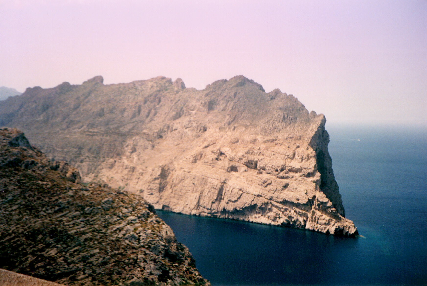 Image Description: Steep coastal cliffs on a ricky headland jutting out into the calm blue ocean in early morning light, scenic, landscape, view