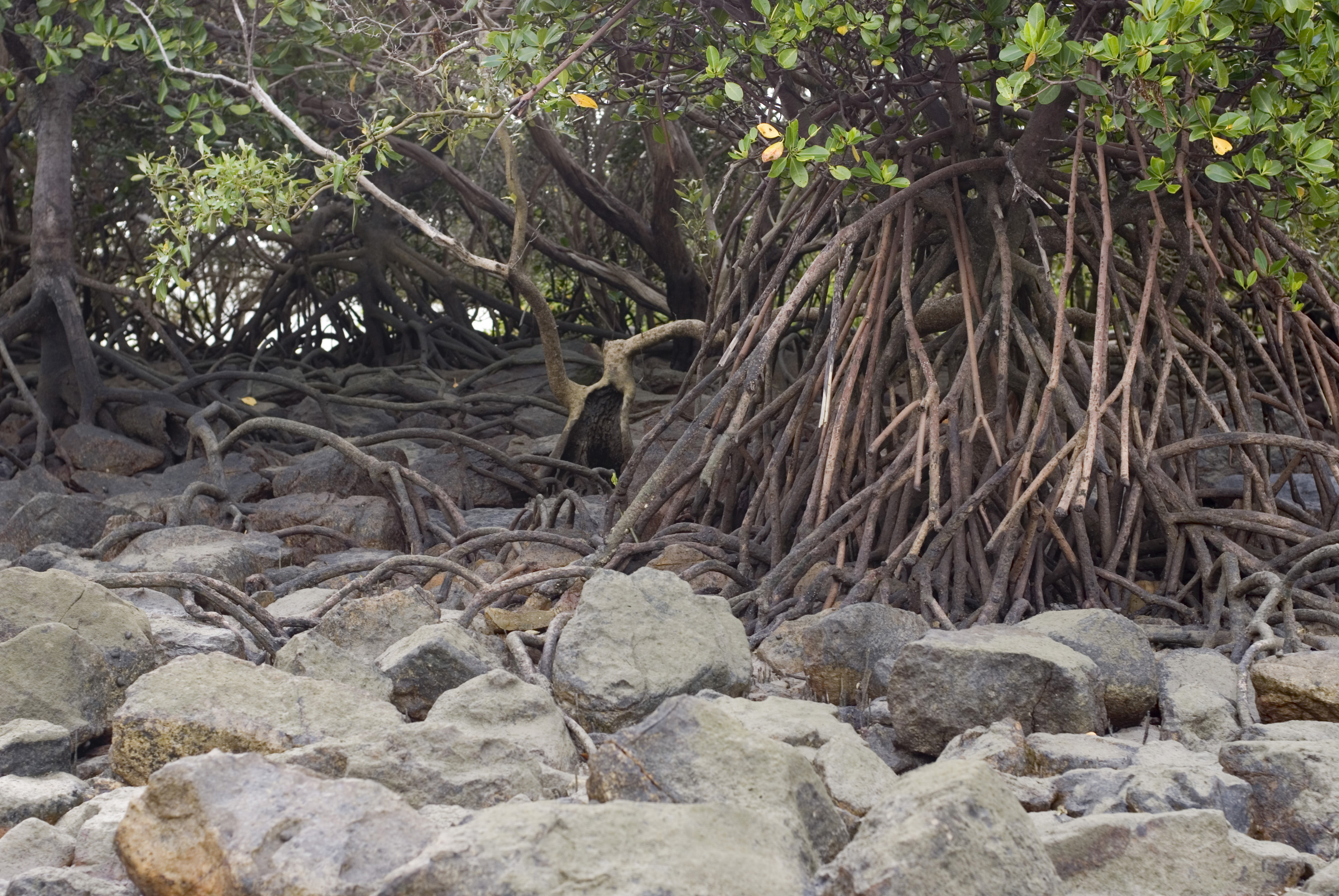 Image Description: Close up low angle view of complex mangrove roots and rocks at low tide