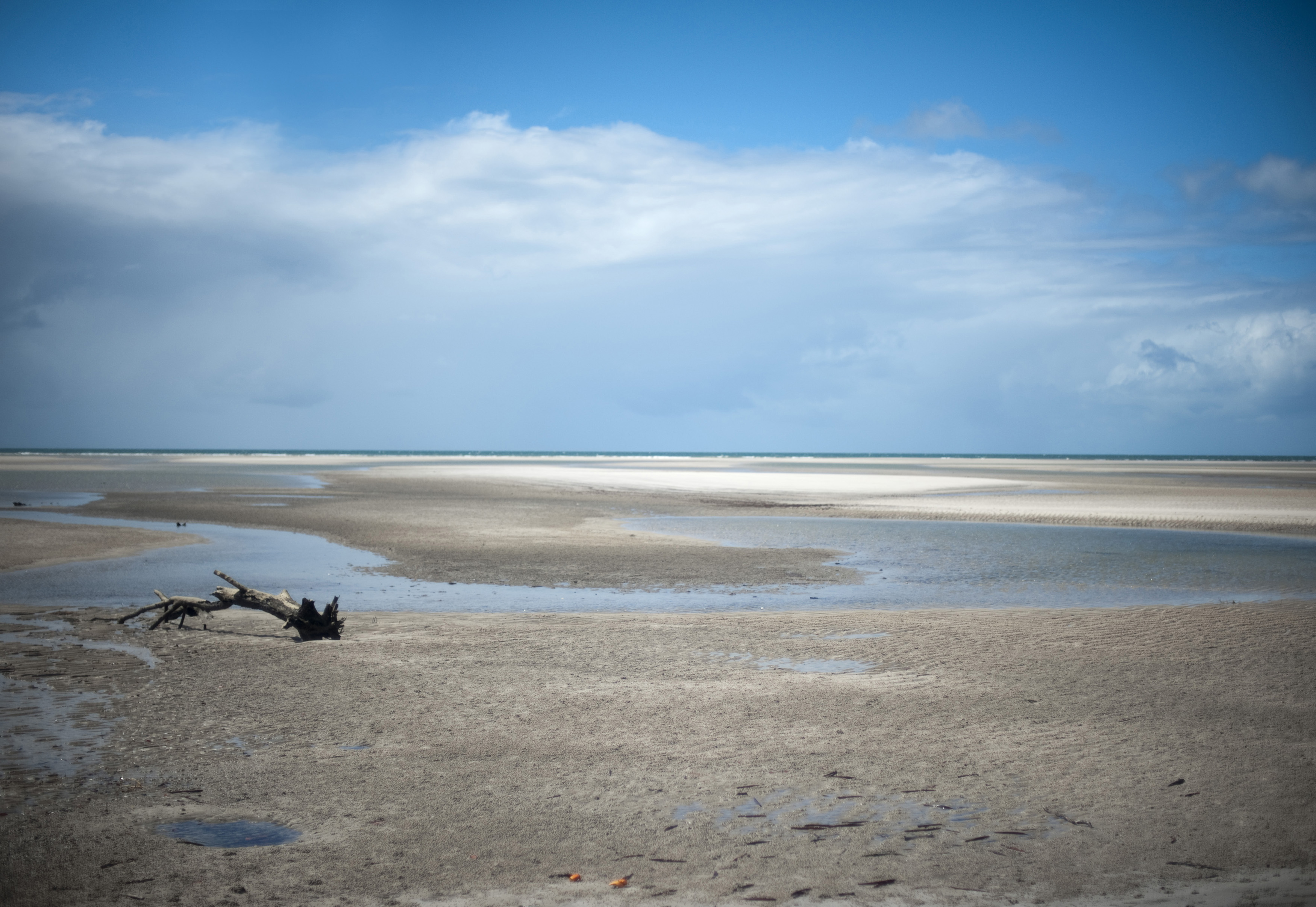 Image Description: Coastal estuary with sandbanks of golden beach sand and drift wood, landscape view on a cloudy blue sky day