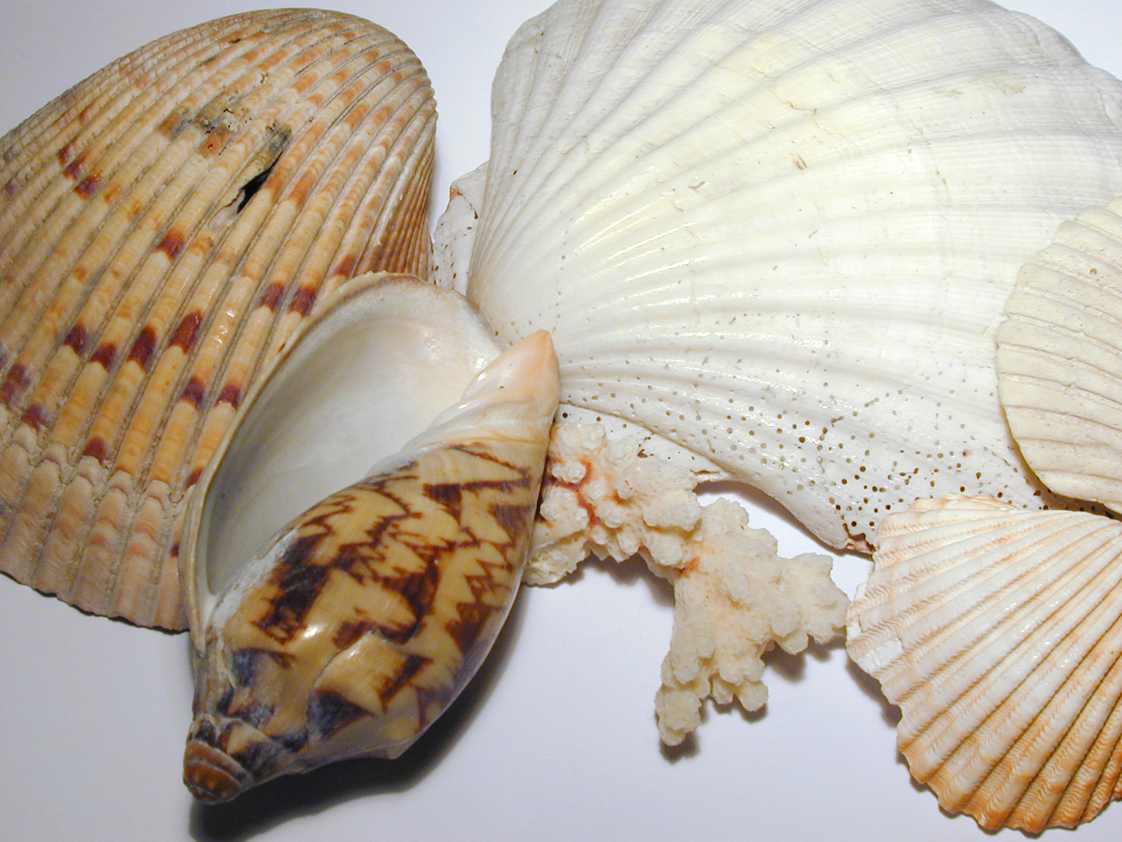 Image Description: Collection of assorted seashells and small pieces of coral, a memento and souvenir of a summer vacation at the seaside