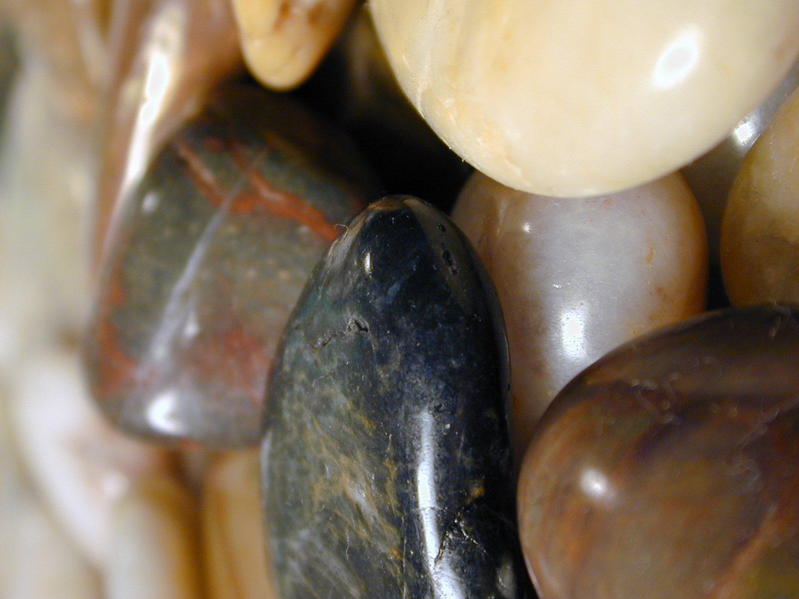 Image Description: Collection of smooth pebbles or stones with their surfaces eroded to a smooth shine by the tumbling action of water in the sea or river