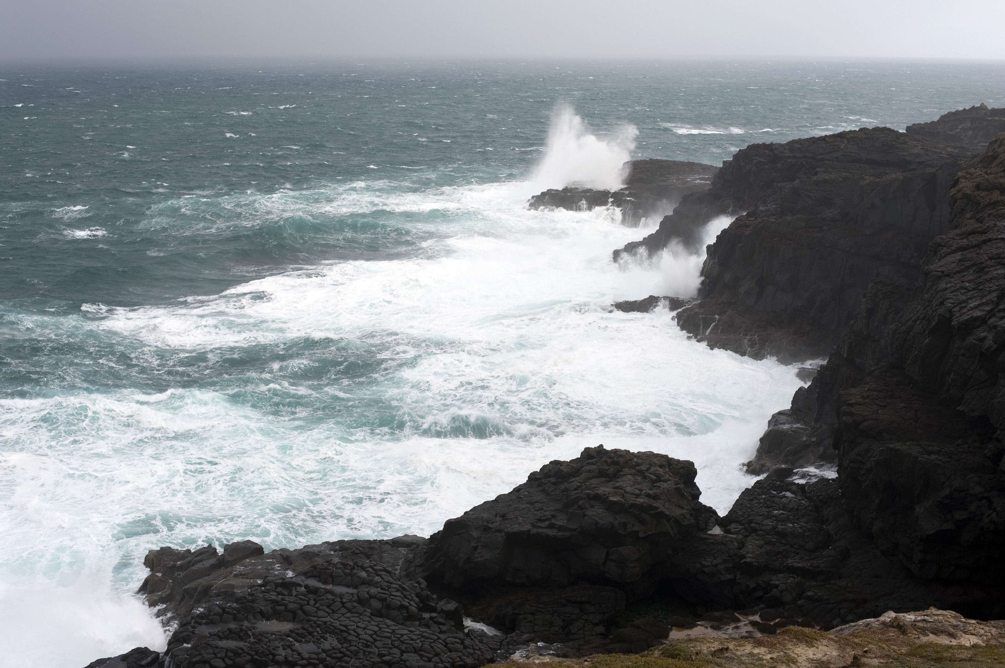 Image Description: waves crashing against a rough foreboding coastline