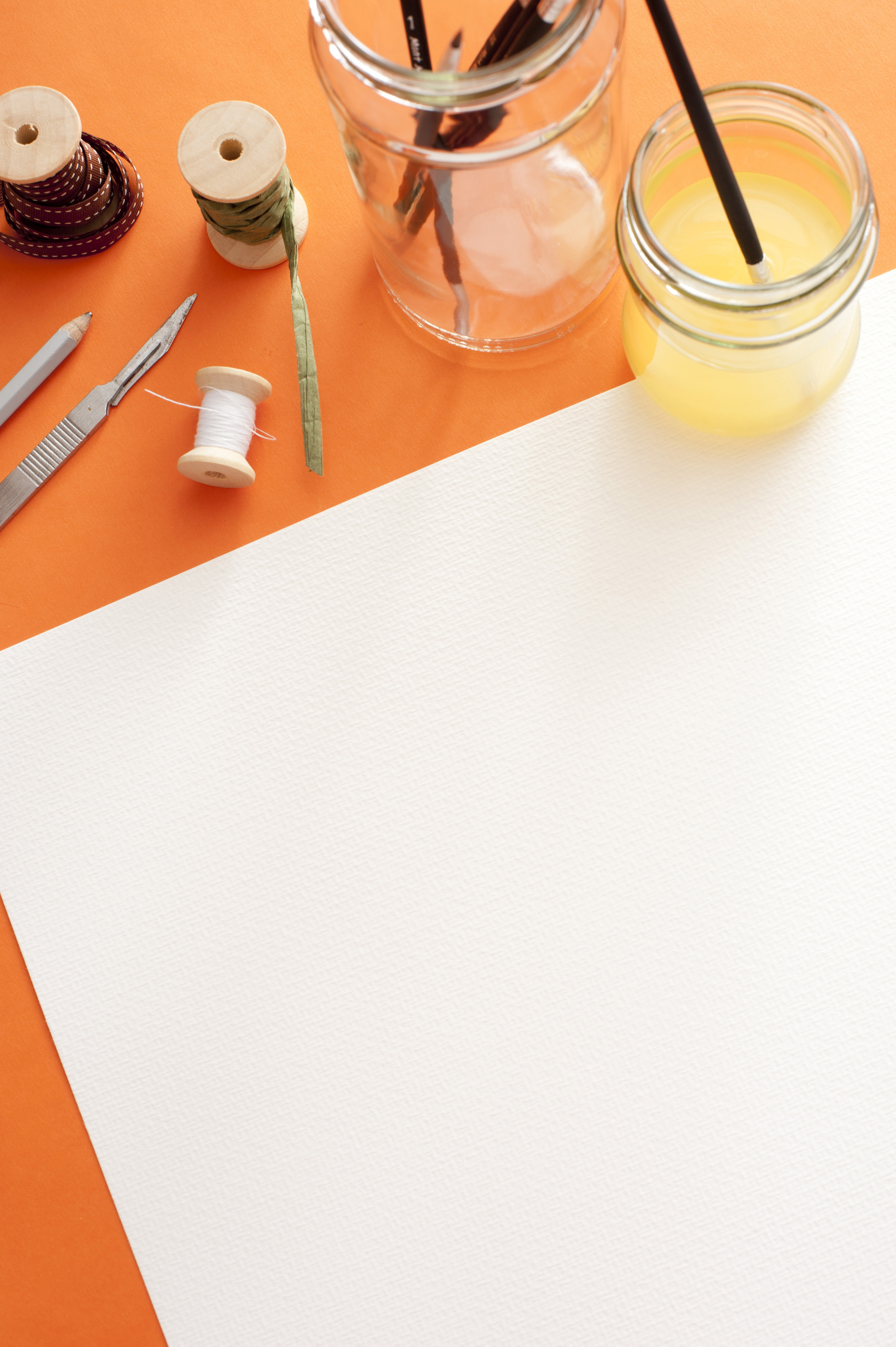 Image Description: Blank white canvas paper with copy space under spools, knife, brushes and paint on the top edge