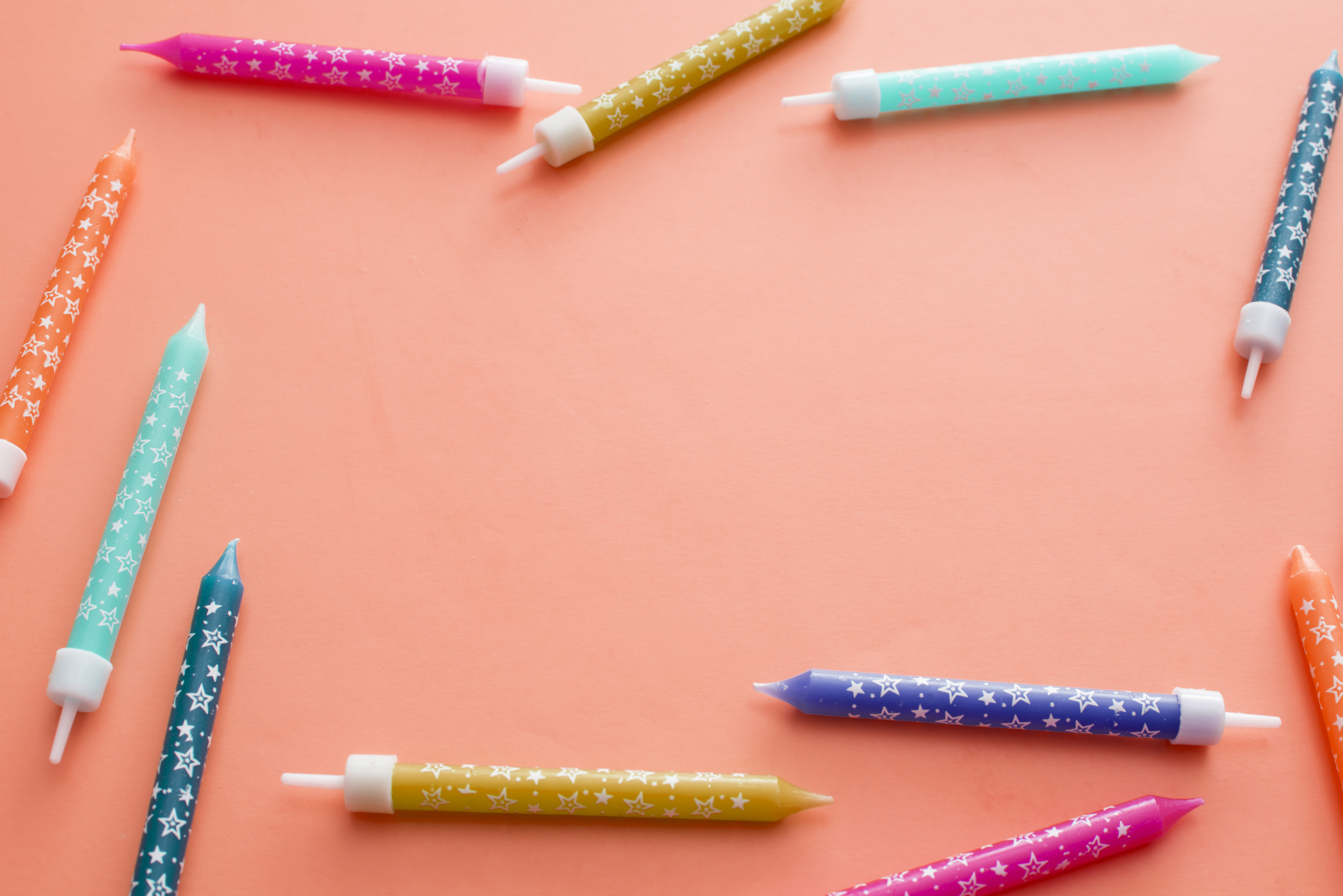 Image Description: Frame of colorful spiral party candles arranged on an orange pink background with central copy space