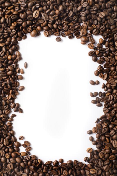 Image Description: Border of aromatic medium roast coffee beans arranged around central white copy space for your text or advertising