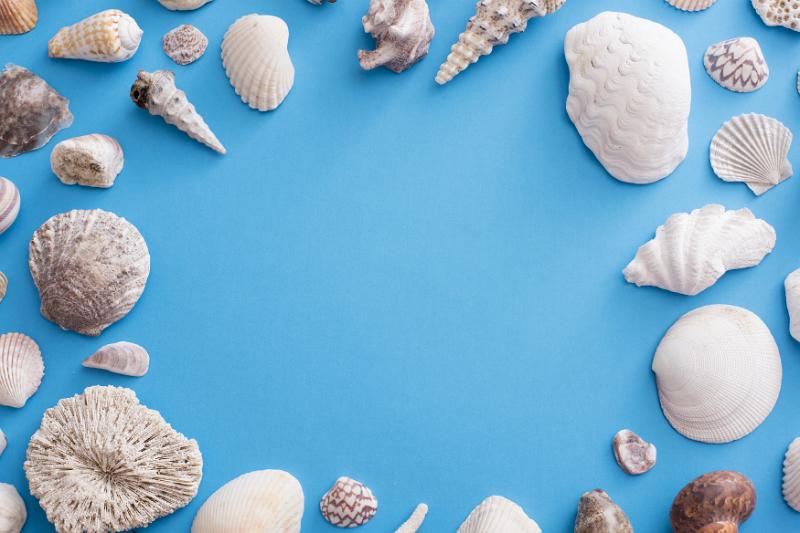 Image Description: pretty marine or nautical shell frame or border with assorted seashells on a blue background with central copy space