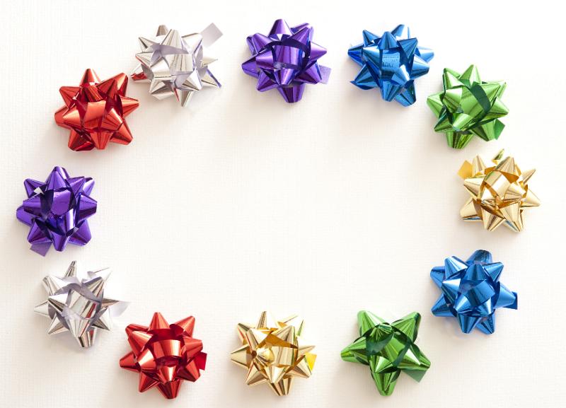 Image Description: Circle composed of metallic bows on white background colored purple, blue, gold and silver
