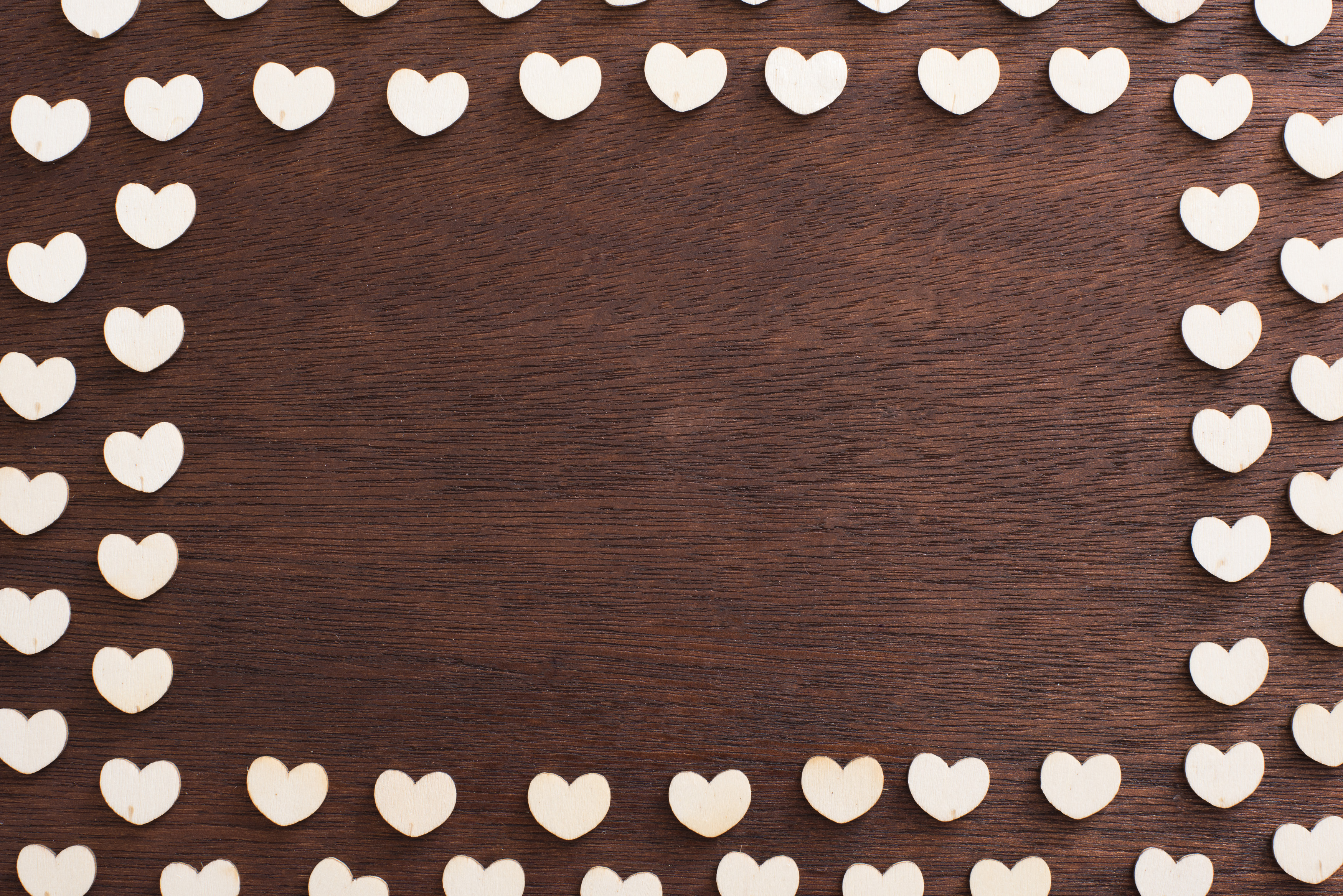 Image Description: White heart border or frame on a wooden background with central copy space symbolic of love and romance