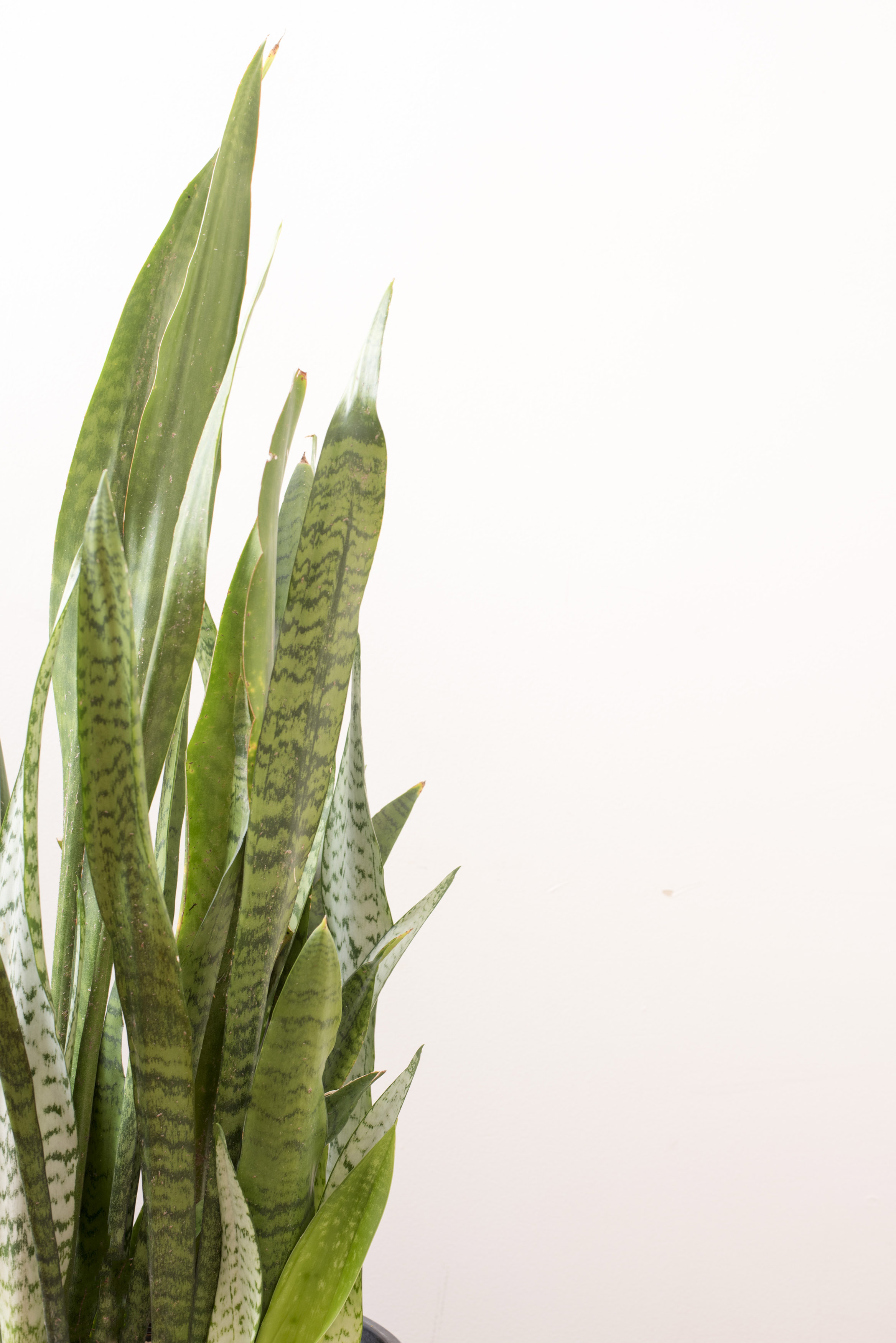 Image Description: Sansevieria trifasciata plant with variegated leaves, also known as the snake plant or Mother in Laws Tongue, over a white background with copy space