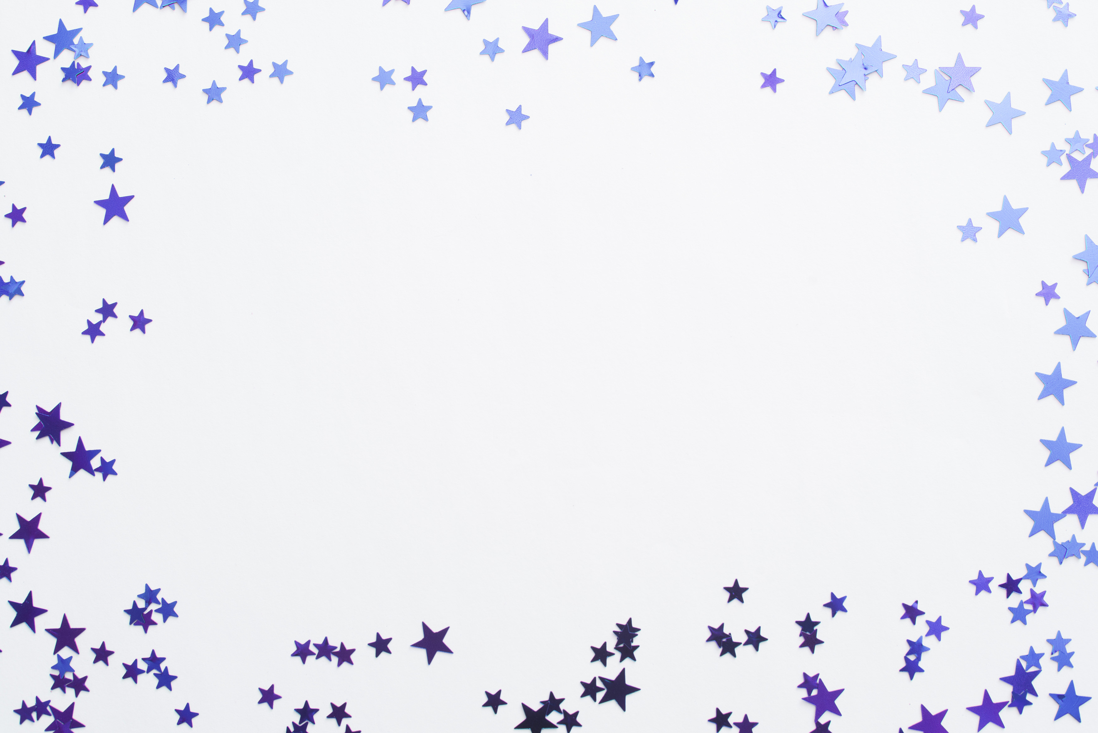 Image Description: a frame of purple metallic stars of differing size with white background and space for text