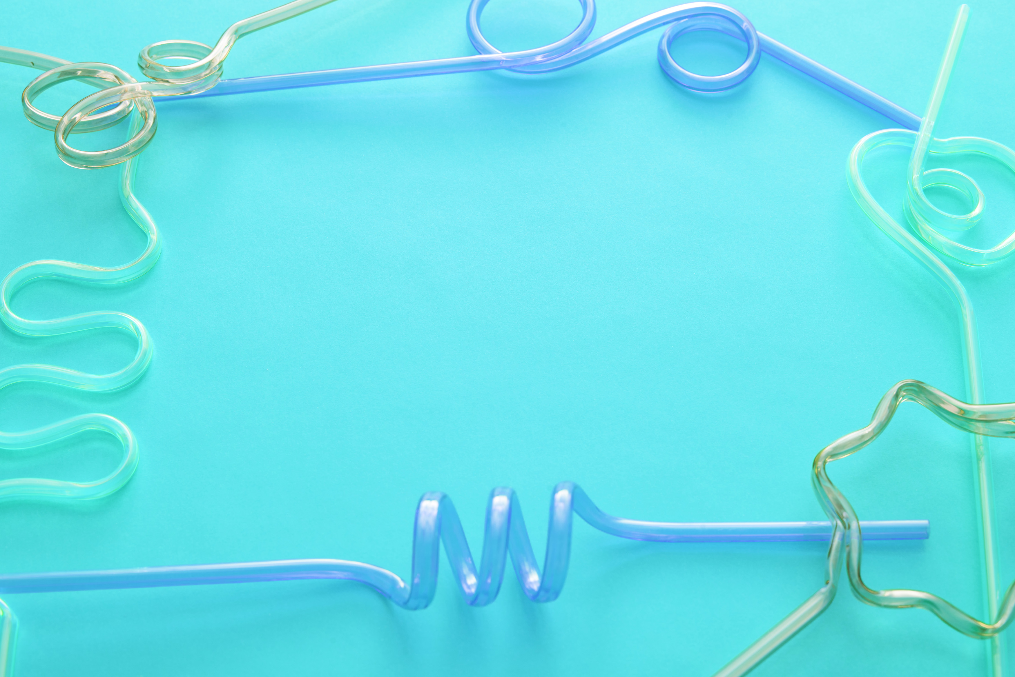 Image Description: Frame made from curly straws over aqua color background with copy space for childhood theme
