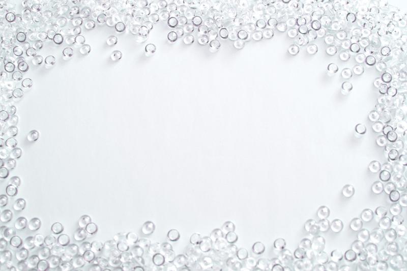 Image Description: Glistening water droplets frame on white with a random arrangement of clean clear water round water drops surrounding central copy space