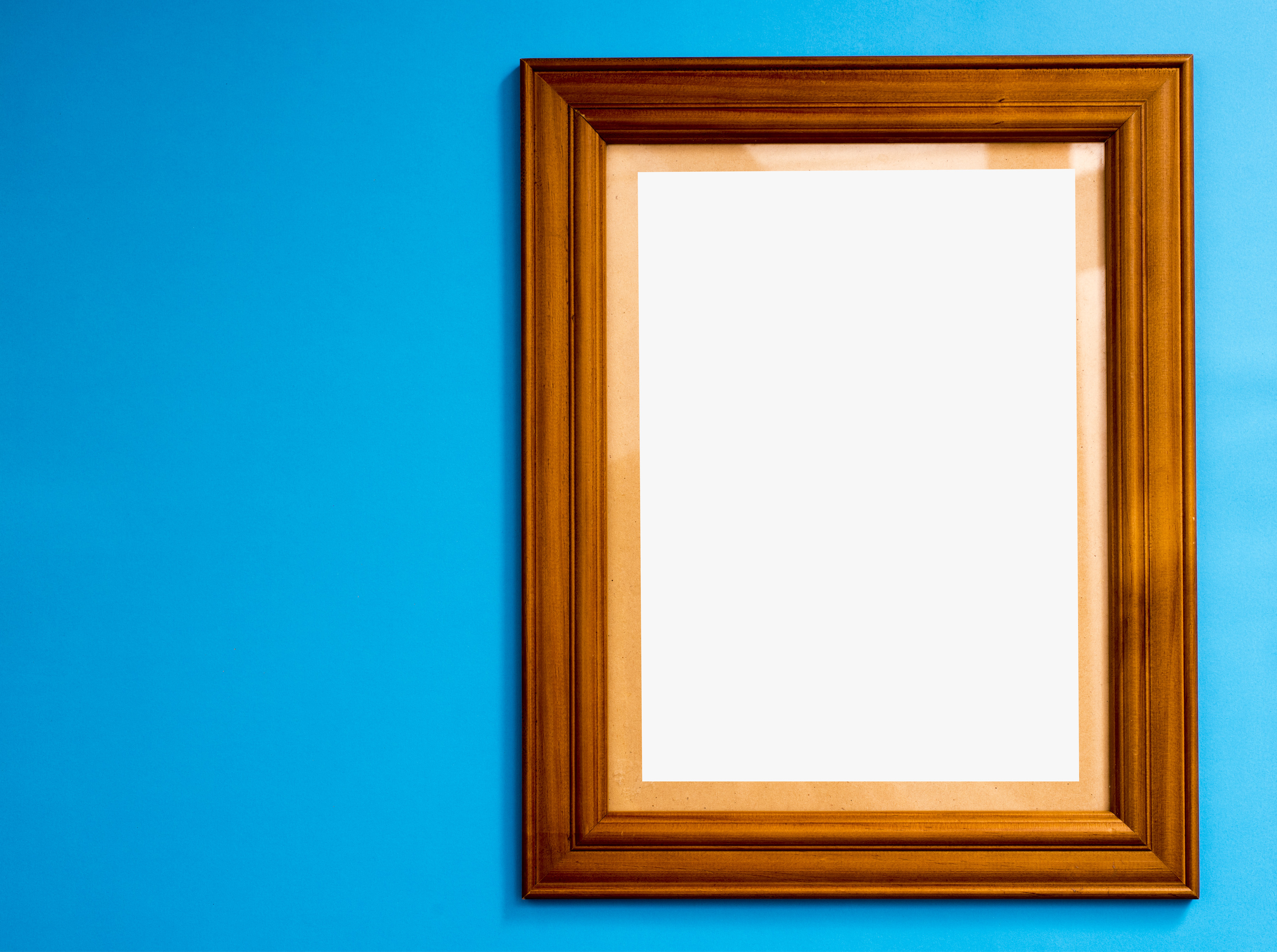 Image Description: Empty wooden frame for your artwork or photo on a blue background with copy space alongside