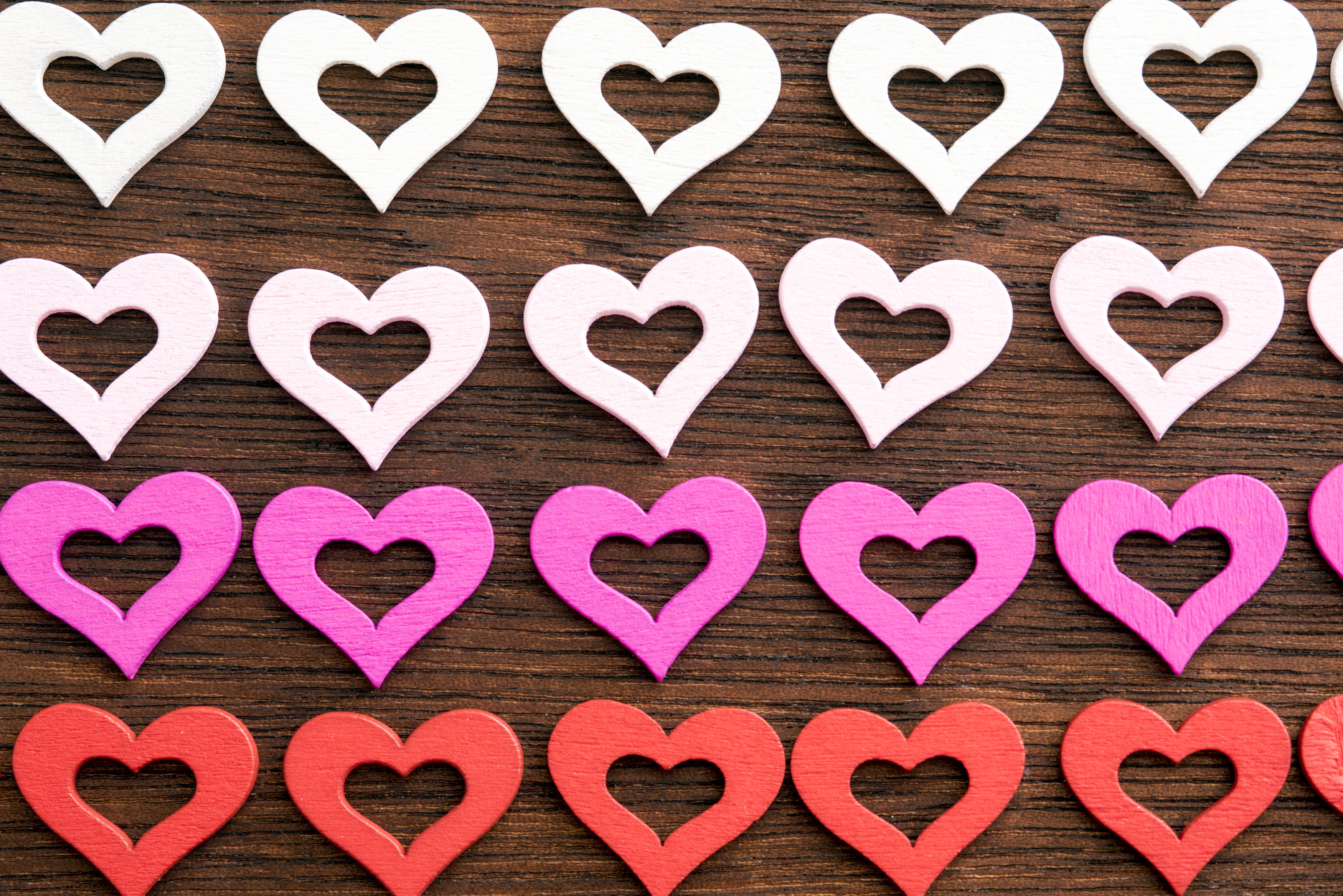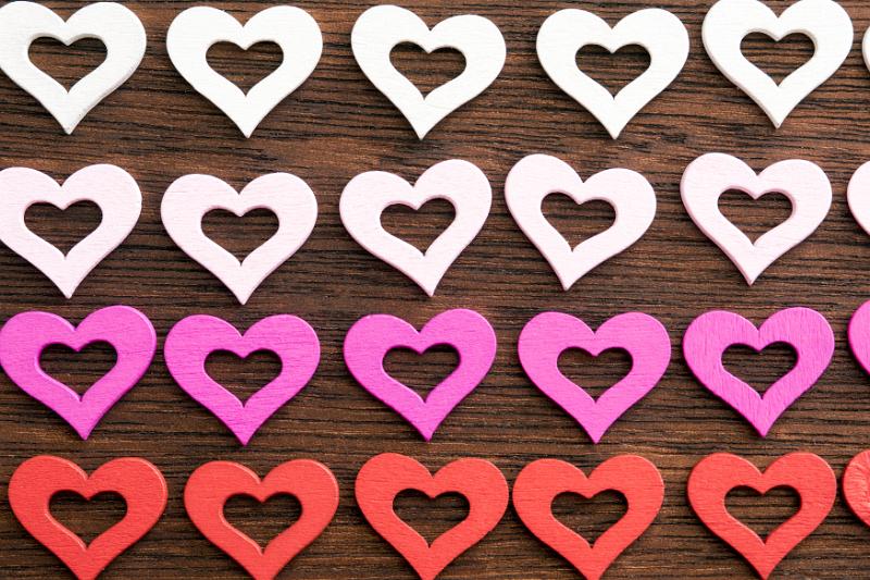 Image Description: Wooden hearts background with modern cut outs arranged in four rows graduating from white through pink to red on wood symbolic of love and romance