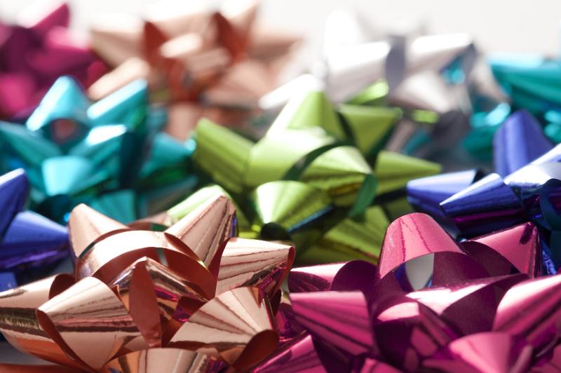Image Description: Background of colorful shiny decorative bows for gift wrapping ad packaging with focus to a pink and coppery one in the foreground