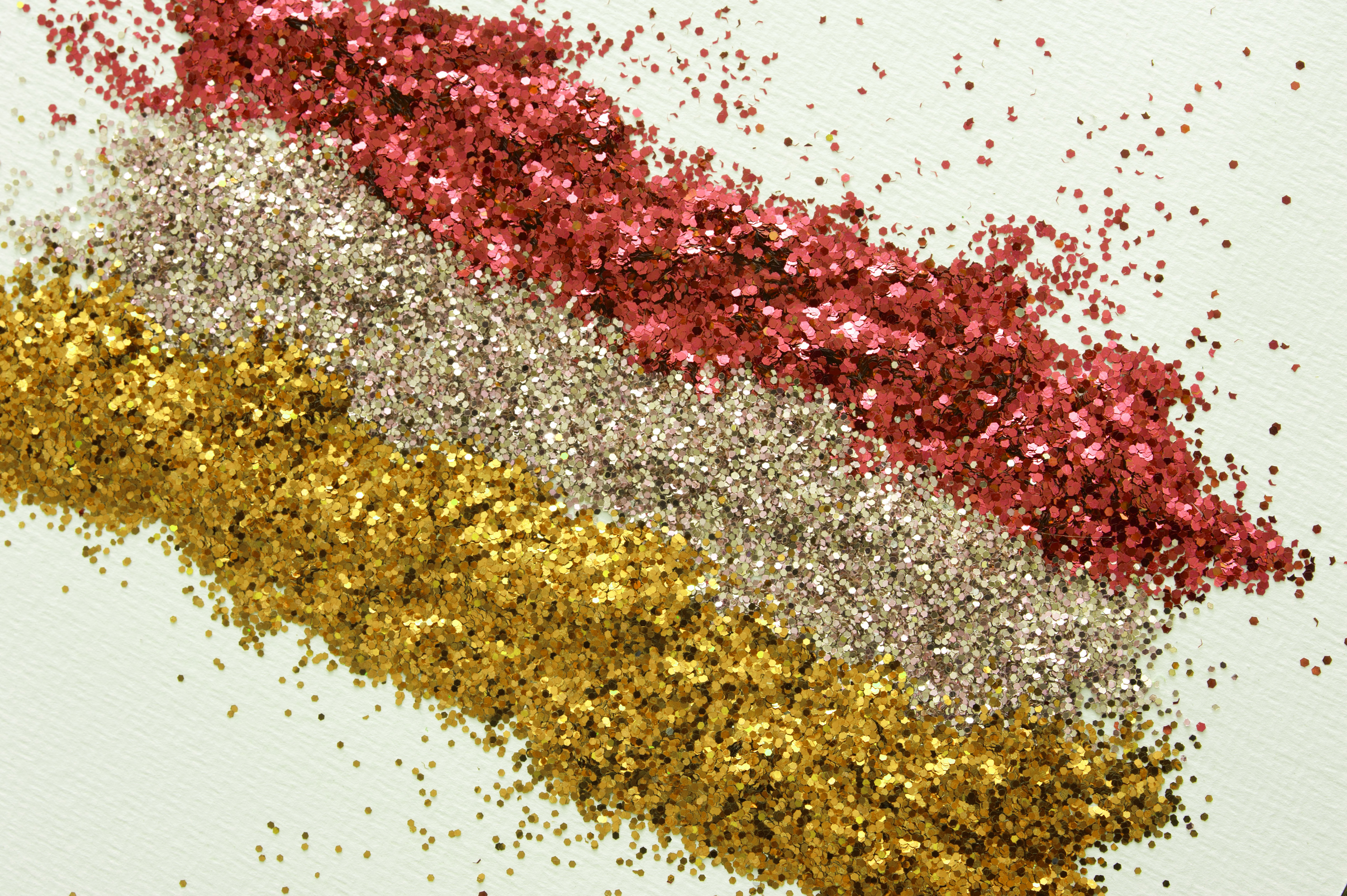 Image Description: Gold and red glitter pattern with three lines of yellow and rose gold and red at a diagonal angle on a white background, high angle view for Christmas or festive occasions