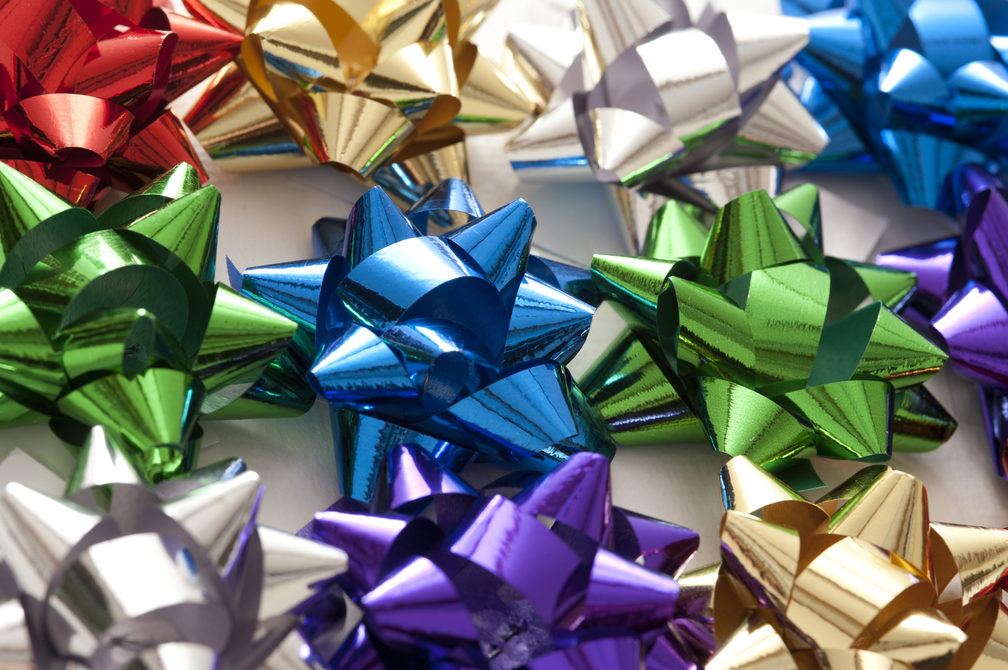Image Description: Colorful background of decorative bows in shiny ribbon for decorating gifts and packaging in assorted colors viewed from above
