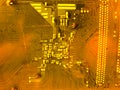 Image Description: Top down close up detail view on holes in purple circuit board with copy space for theme about technology