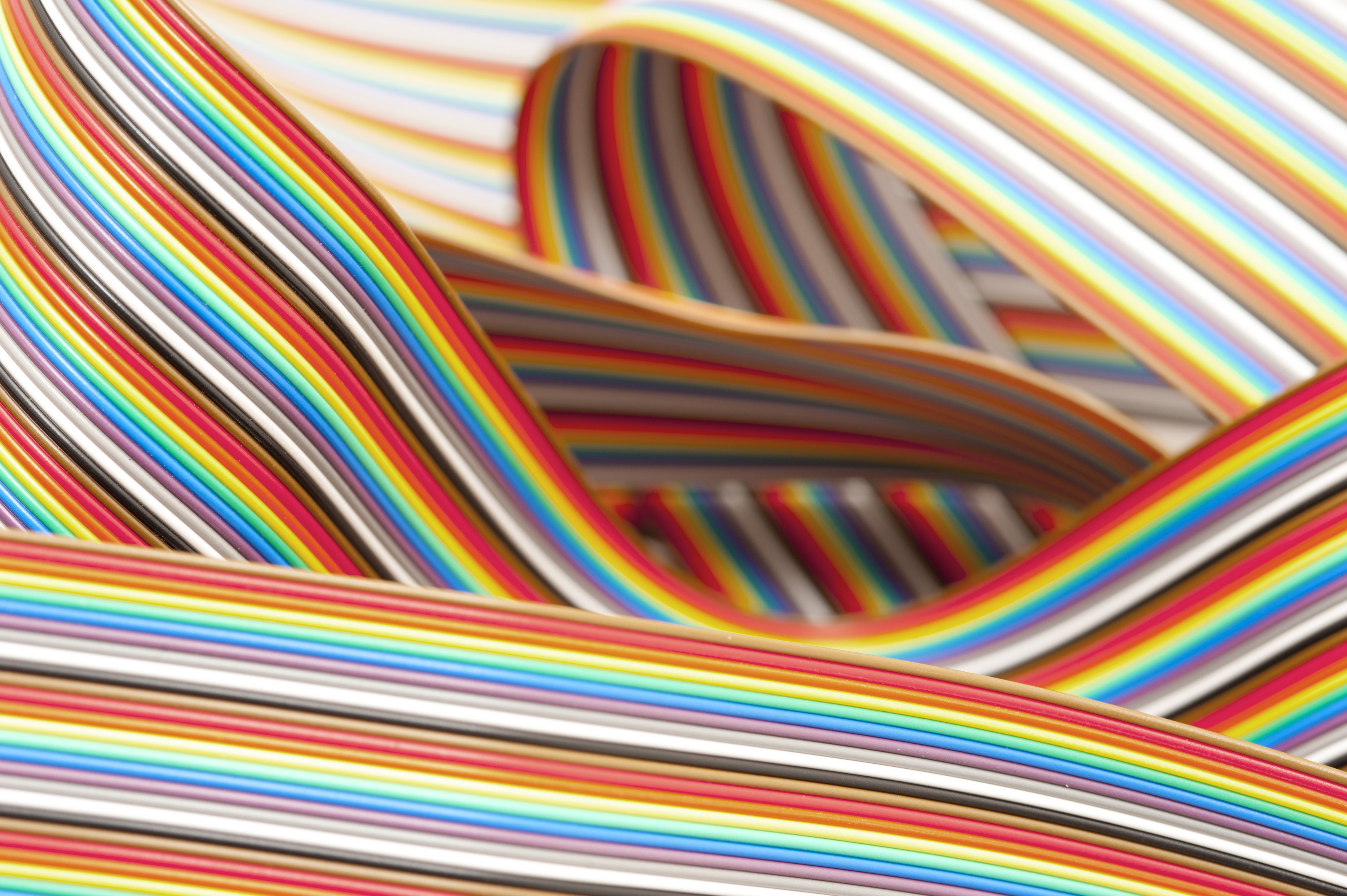 Image Description: Colorful ribbon wires bent and curved in tangled manner for background about technology