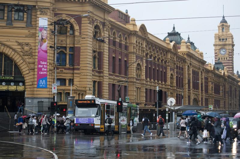Image Description: Busy street scene in Melbourne, Australia on a rainy day with passengers and a tram in front of the entrance to the Flinders Street station