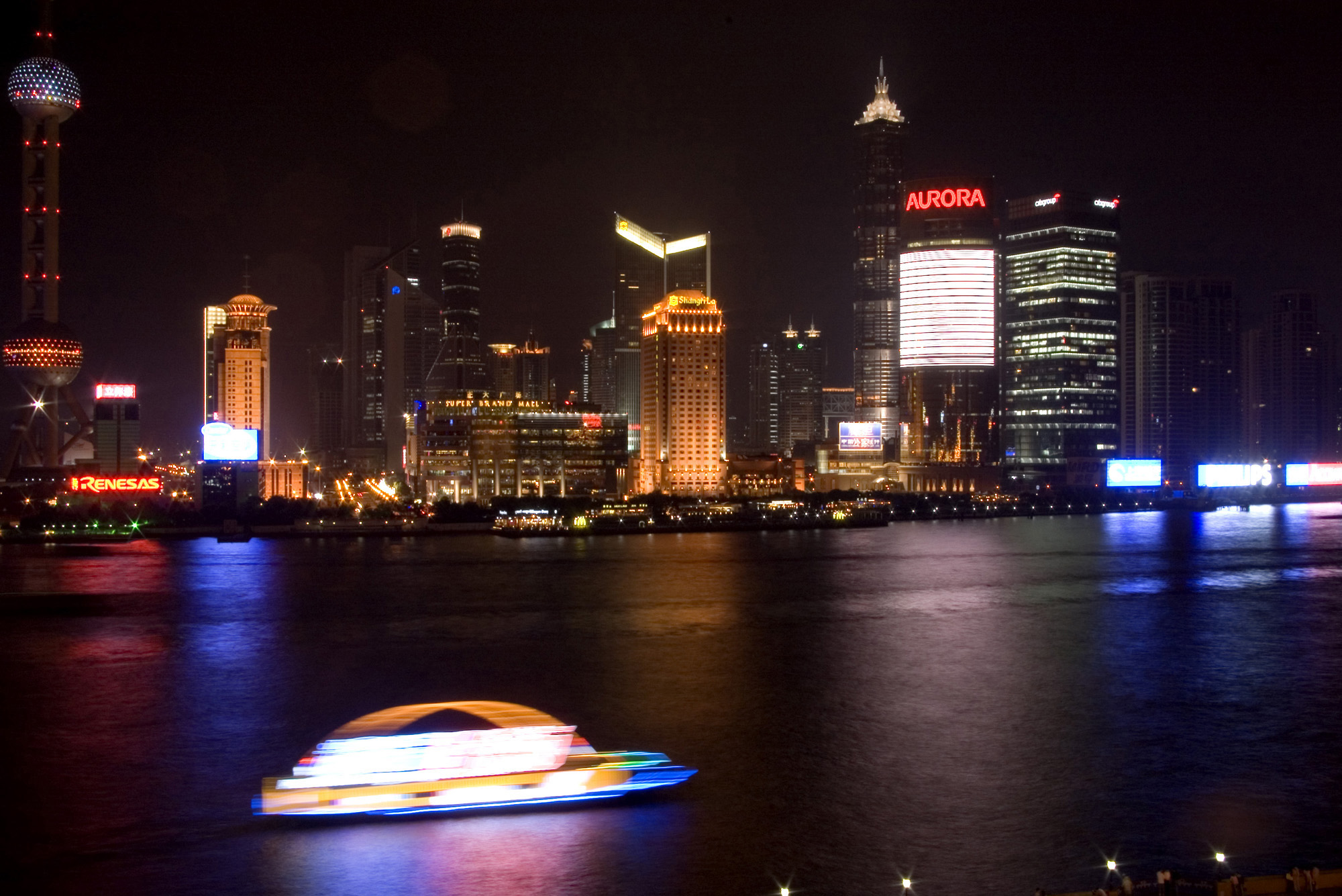 Image Description: Long Exposure of Shanghai at Night - Blurred Boat on River Traveling Past Illuminated Skyline of Shanghai, China