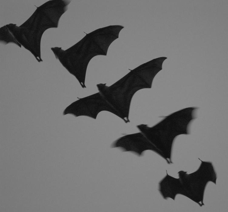 Image Description: formation of flying bats flying in a row on a grey background