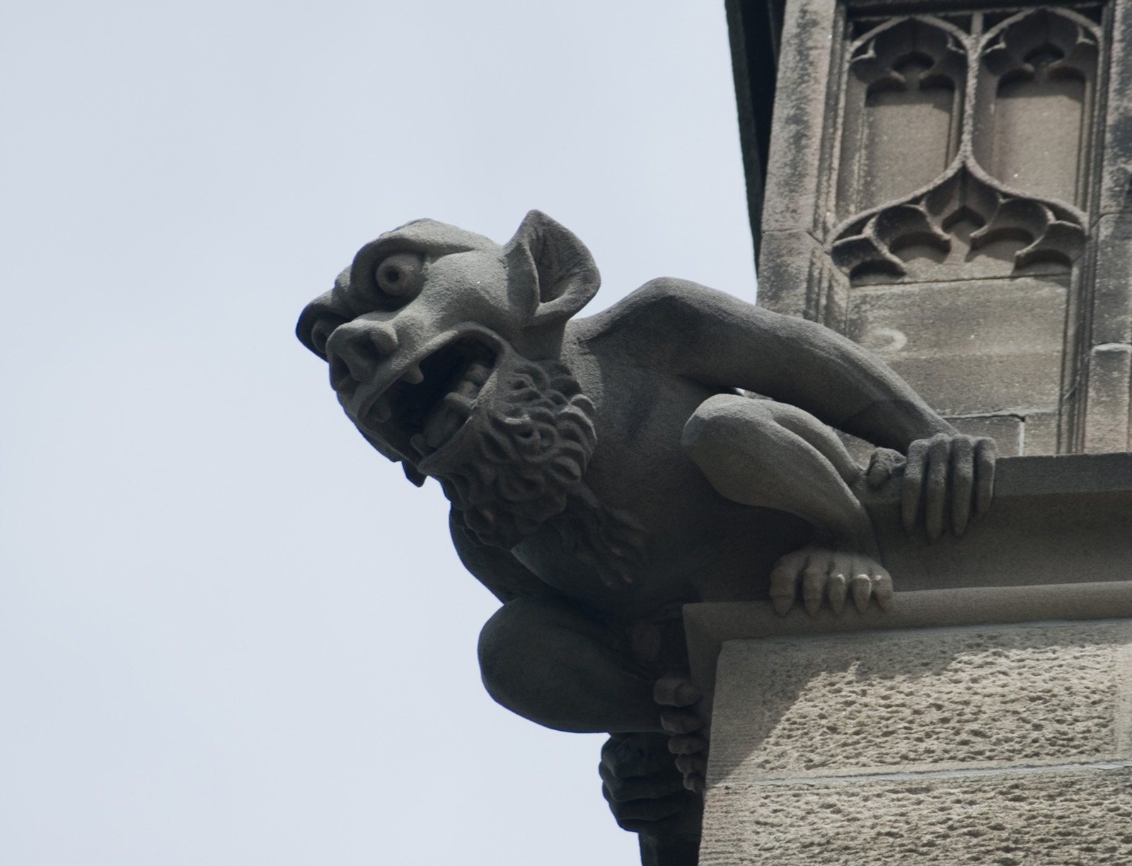 Image Description: grotesque sculpture carved in stone with an ugly face and beard
