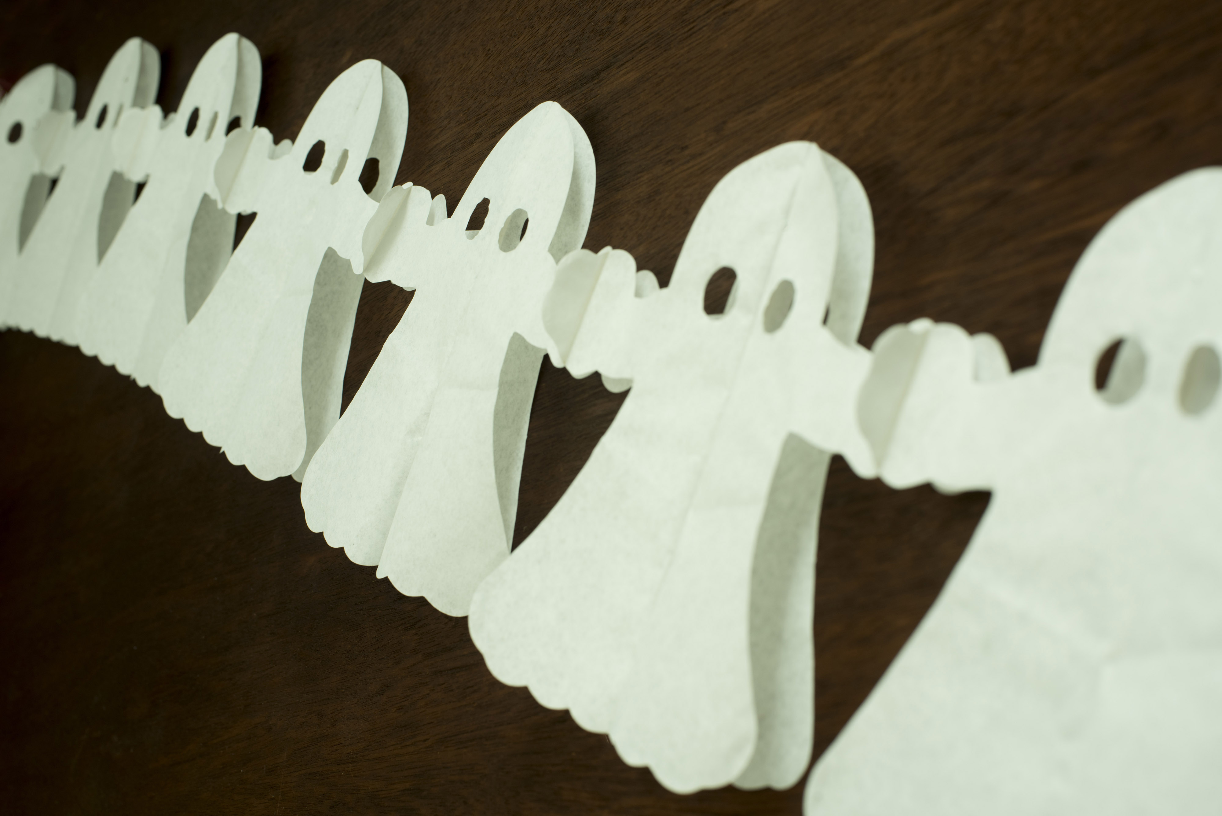 Image Description: a string of green glowing halloween ghost decorations pictured at an angle