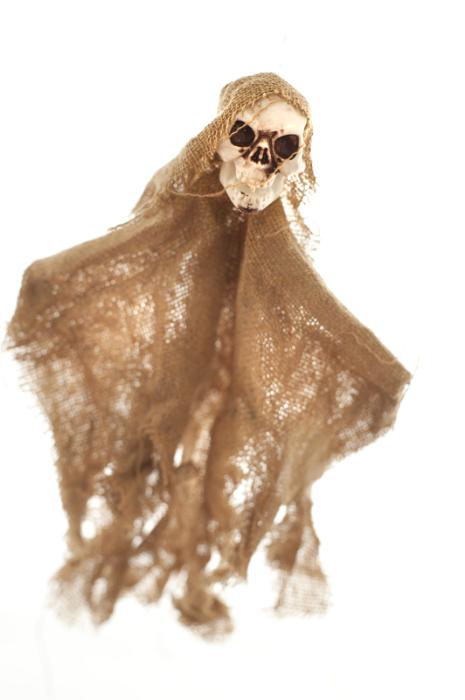 Image Description: Rustic scary homemade Halloween skull doll wrapped in frayed burlap or hessian over a white background