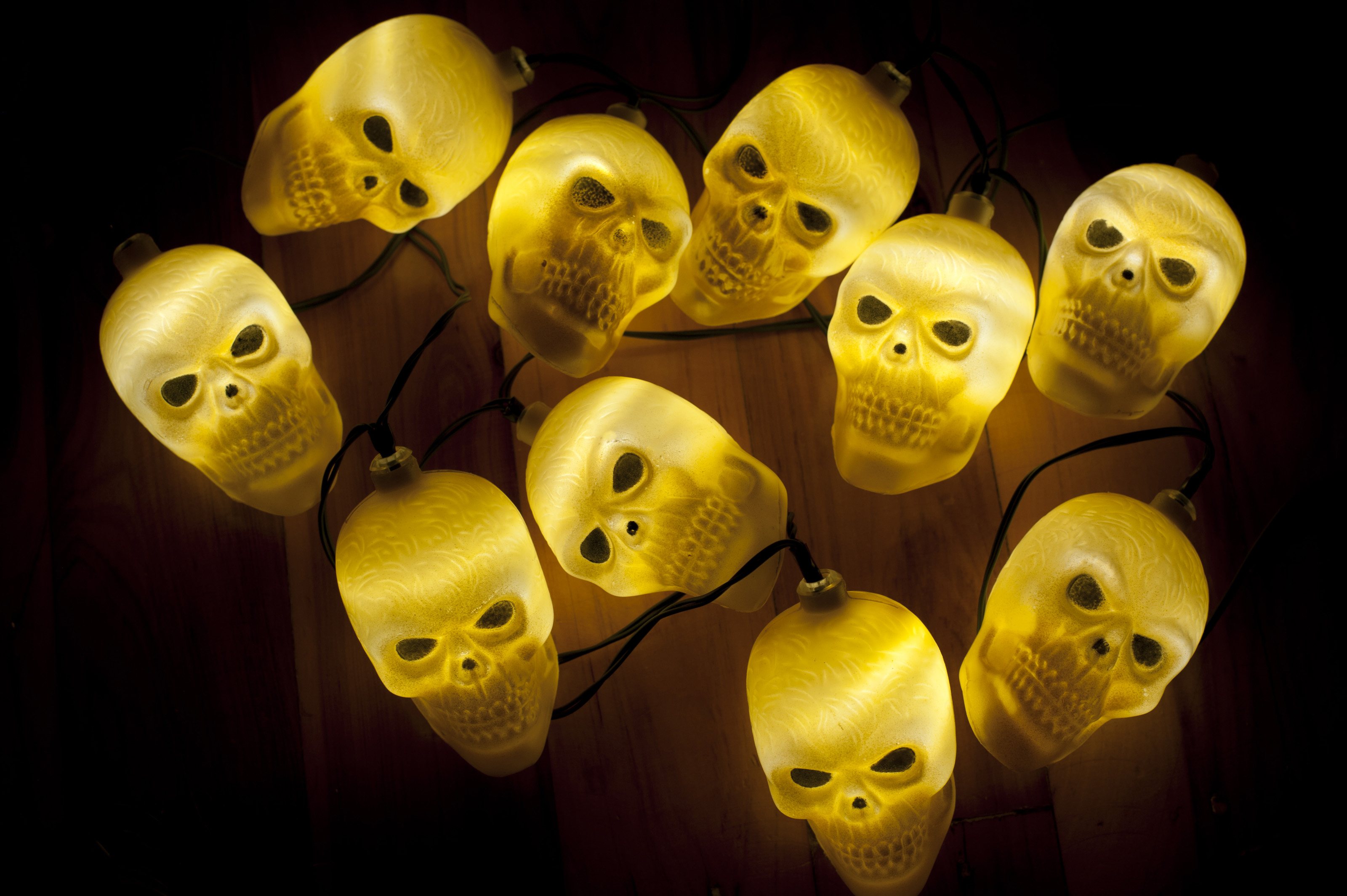 Image Description: Group of glowing yellow Halloween skull lights over a dark background to celebrate the season of Horror