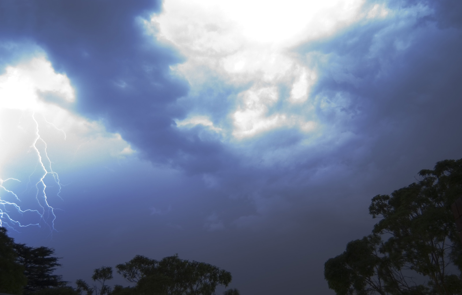 Image Description: stormy lightning bolt flashing down from moody looking storm clouds
