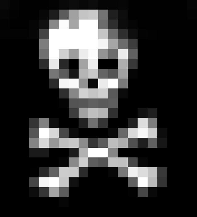Image Description: skull digital image with large white and grey pixels