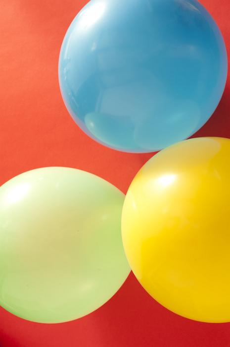 Image Description: High Angle View of Three Inflated Balloons on Red Background, in Yellow, Blue and Green Colors