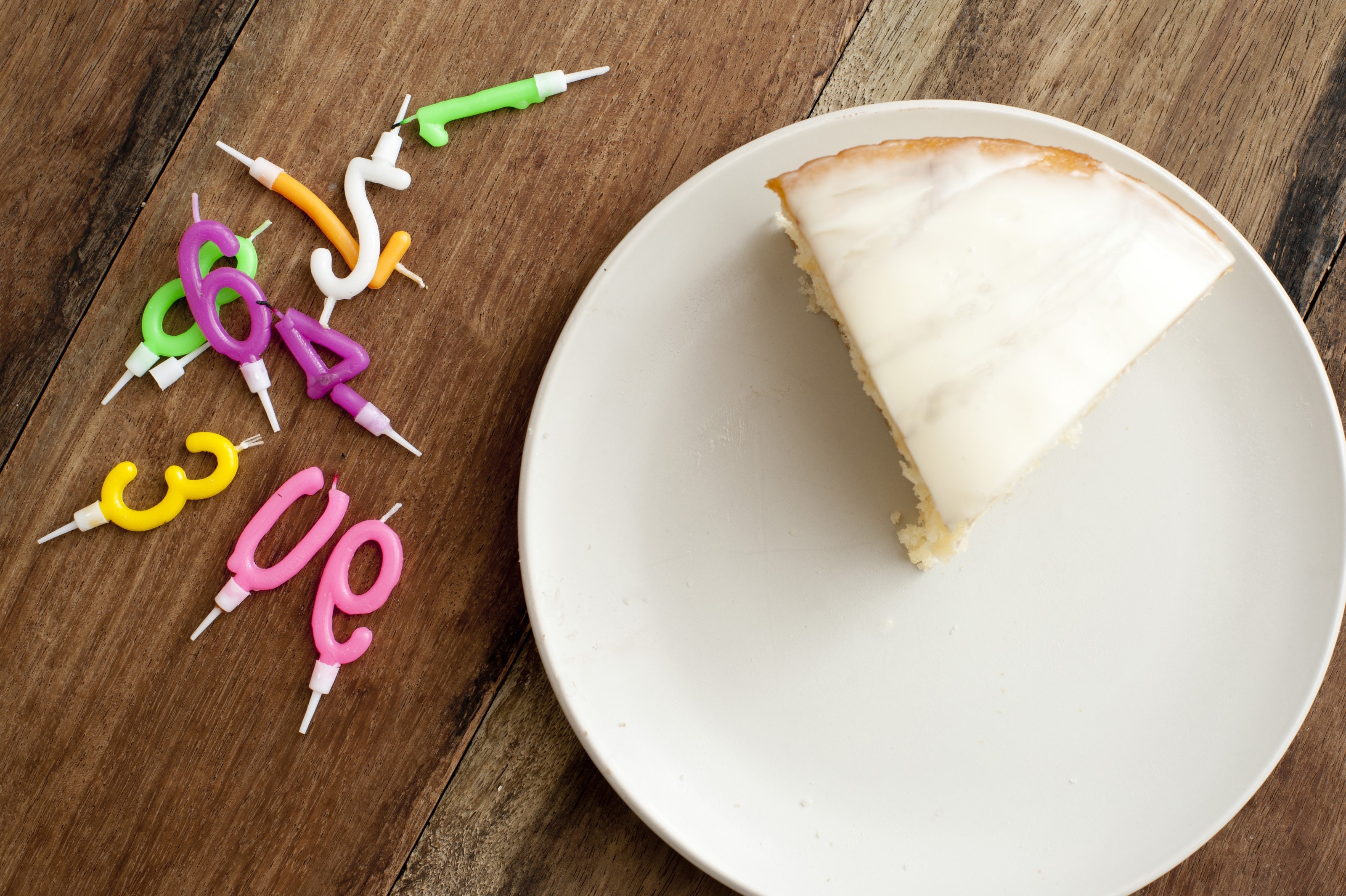 Image Description: High Angle View of Slice of Cake on White Plate with Birthday Number Candles to the Side on Wooden Background