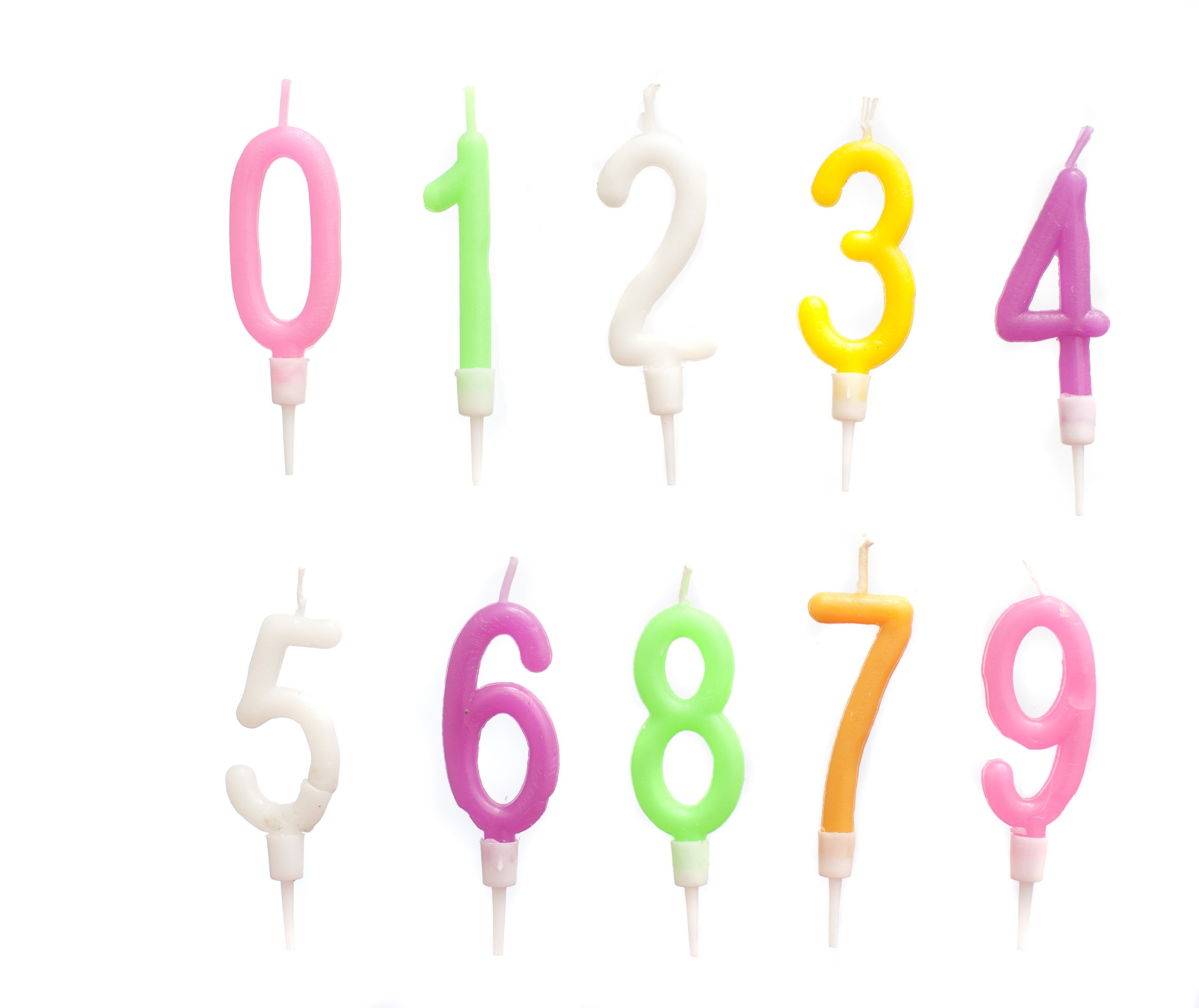 Image Description: Colourful birthday candles in the form of numbers in a complete set 0 through 9 isolated on white