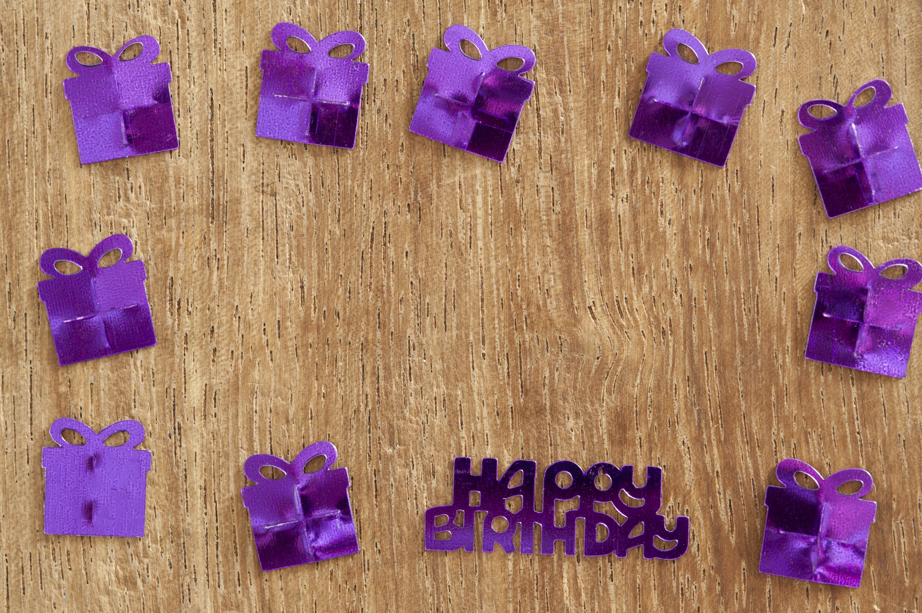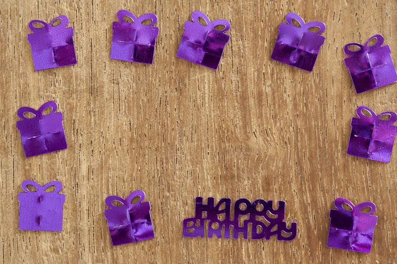 Image Description: Purple Metallic Birthday Confetti Arranged in Square Border on Wooden Background, Shaped like Wrapped Presents with Birthday Message in Middle