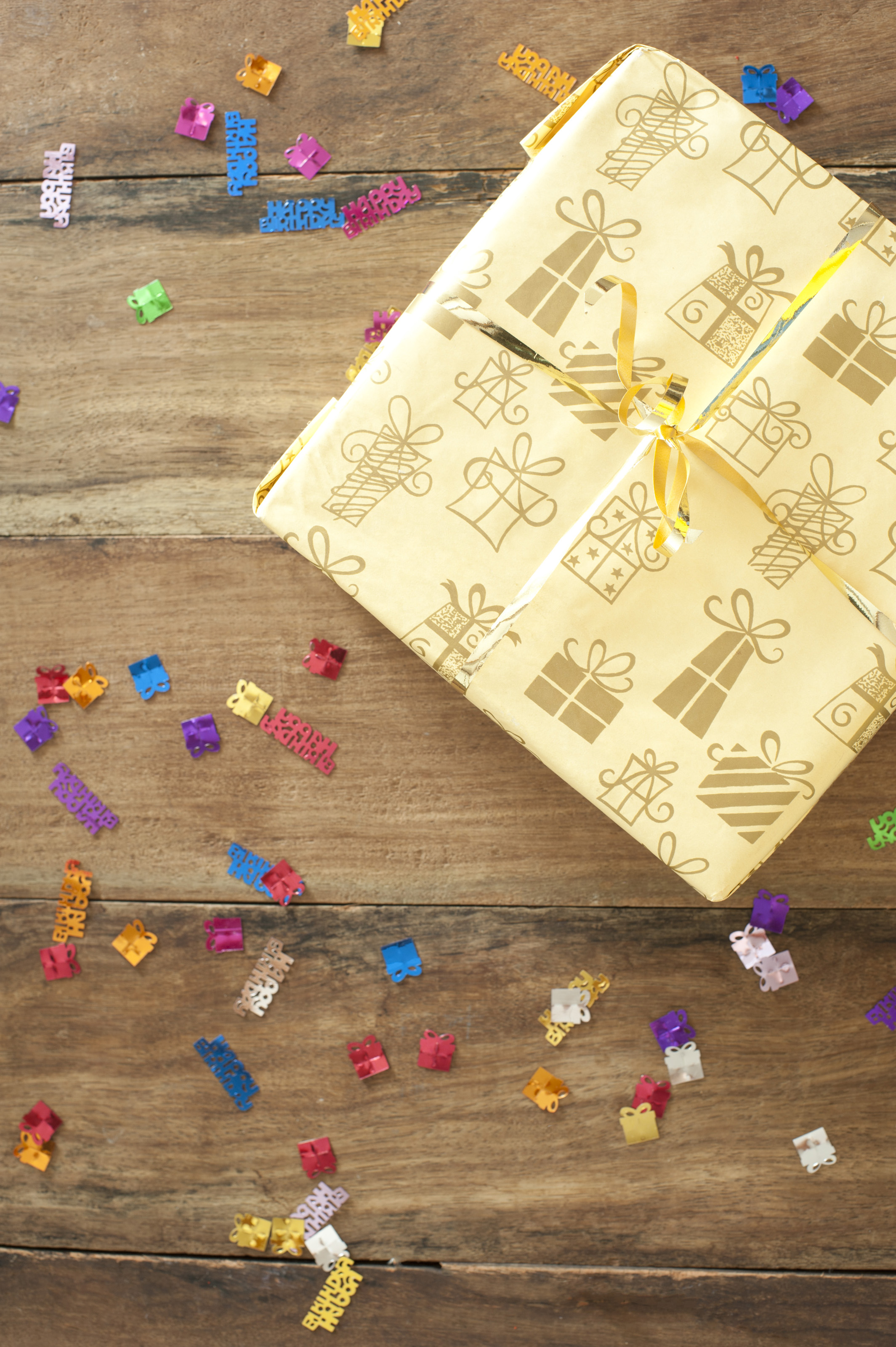 Image Description: Giftwrapped decorative birthday present with scattered colorful confetti on a wooden table at a birthday party
